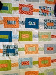After finishing my first two quilts, I started a complicated, time-consuming project, the Off Track pattern from Cluck Cluck Sew. Just the cutting took three days of work (a day’s work is a one or two day session). So it was a bit of a relief to take a break from piecing to try a simpler design and some quick techniques for a new baby, our friends’ daughter Esther, born in September. Her simcha bat (a Jewish naming ceremony) was in January, and I decided after Christmas to make something for her. The fabric leaped out at me and the design was meant to be an abstract letter E.