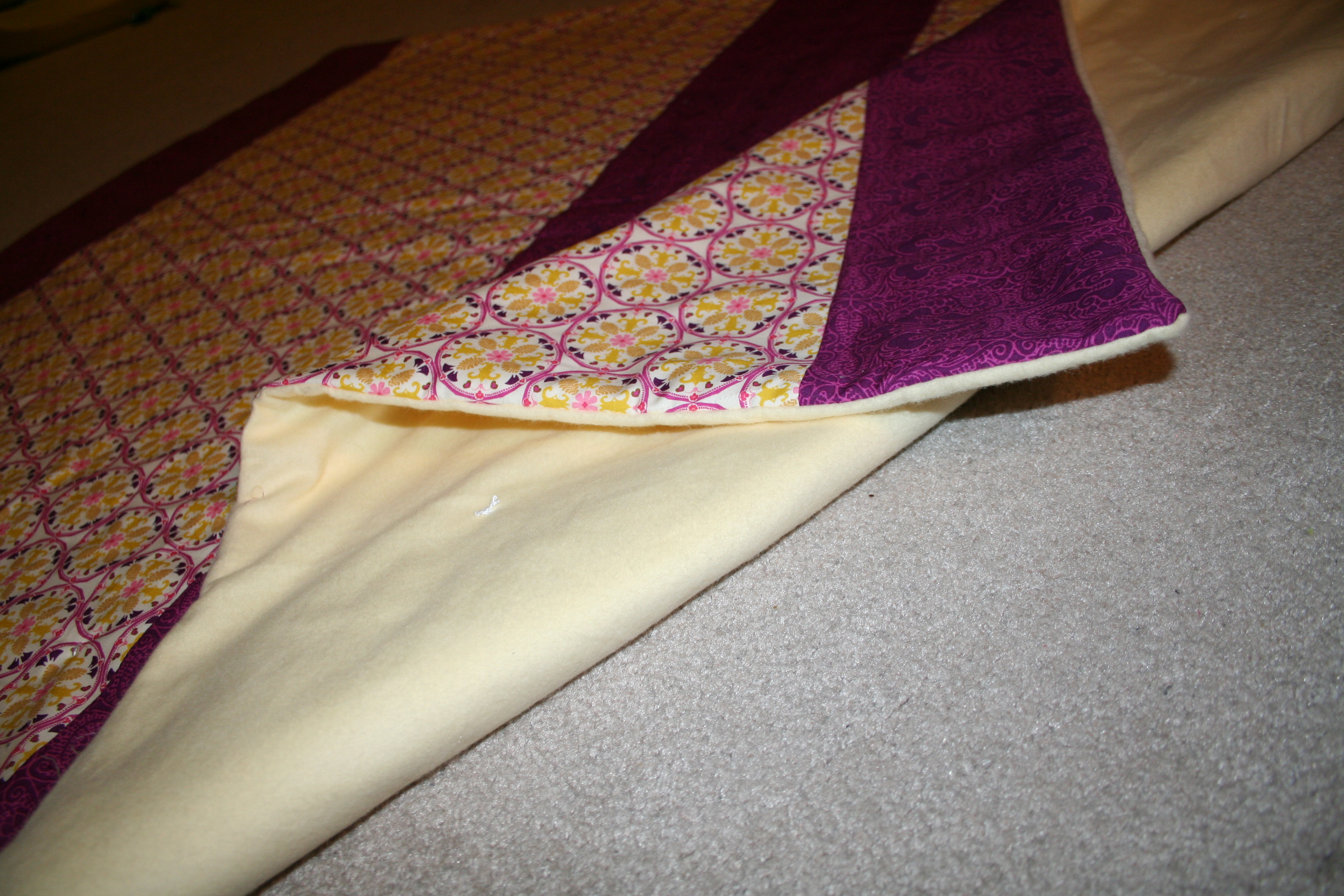 I decided to try the quick turn method of binding, but the first time I stacked and basted, I had one side inside out. But when I tried it again, I was so happy with the results. The backing fabric is really pale yellow flannel for softness, and I used batting for warmth. Quick turning is kind of like making a pillowcase, you sew the layers wrong sides together, leaving a small stretch for turning. Then you pull it inside out, which is actually right sides out, and hand sew the hole with invisible stitches.