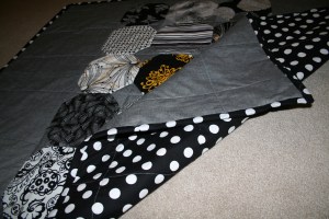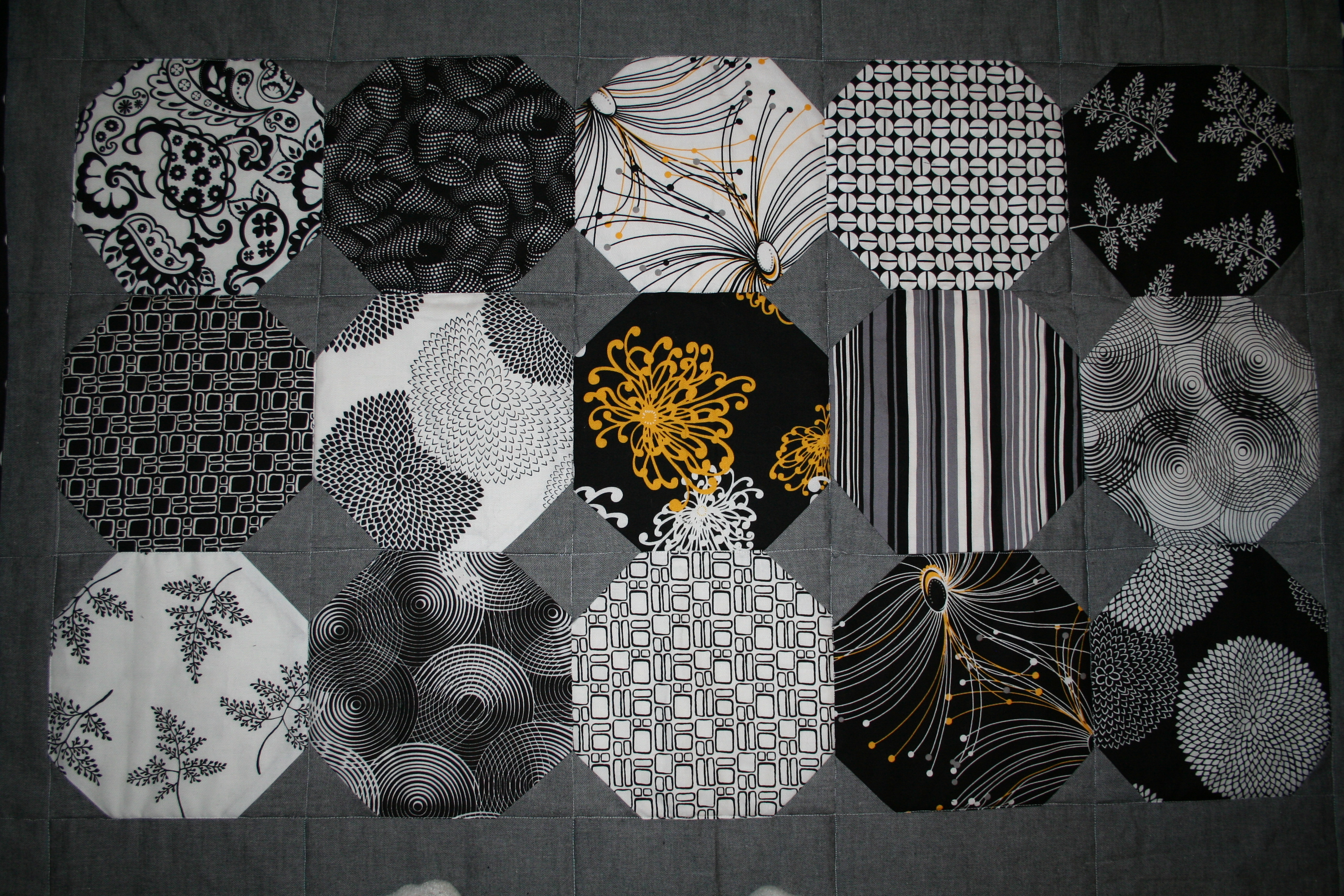 My kids just loved black and white when they were babies, and I thought this would be a fun take on gender-neutral baby decor, since things tend to be yellow or green or pastel. I got the patterns in the clearance bin at my favorite fabric store just before Christmas and really enjoyed the results from trying a snowball block (basically an octagon).