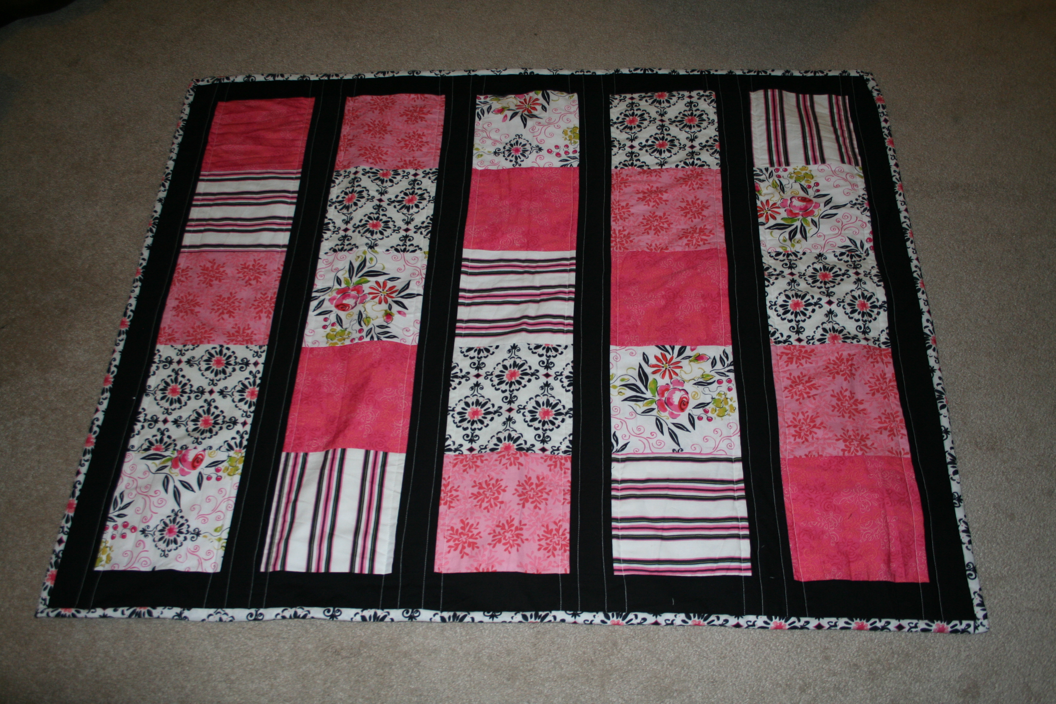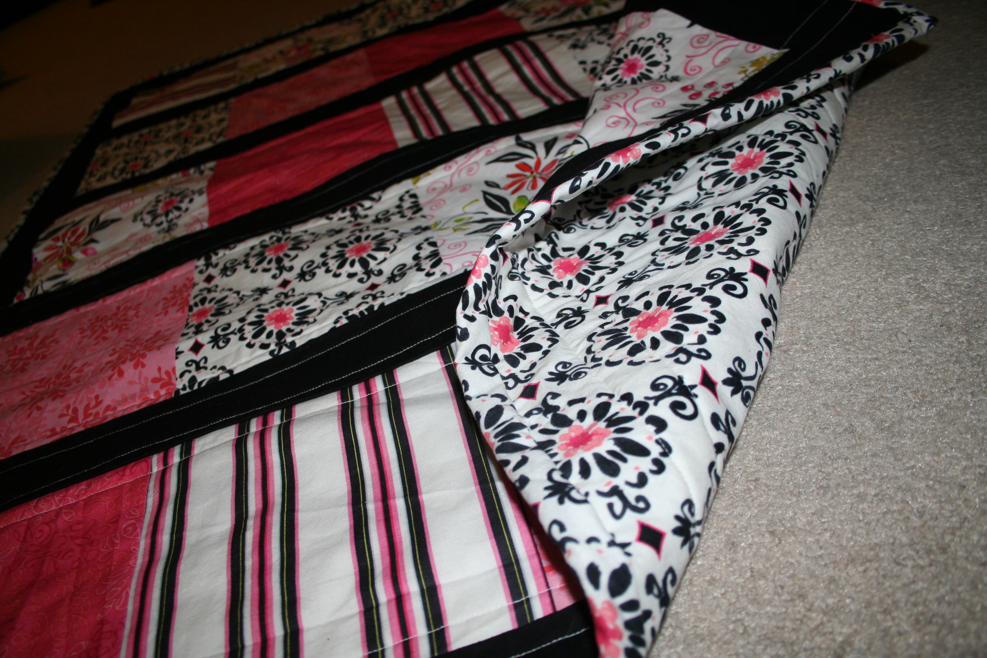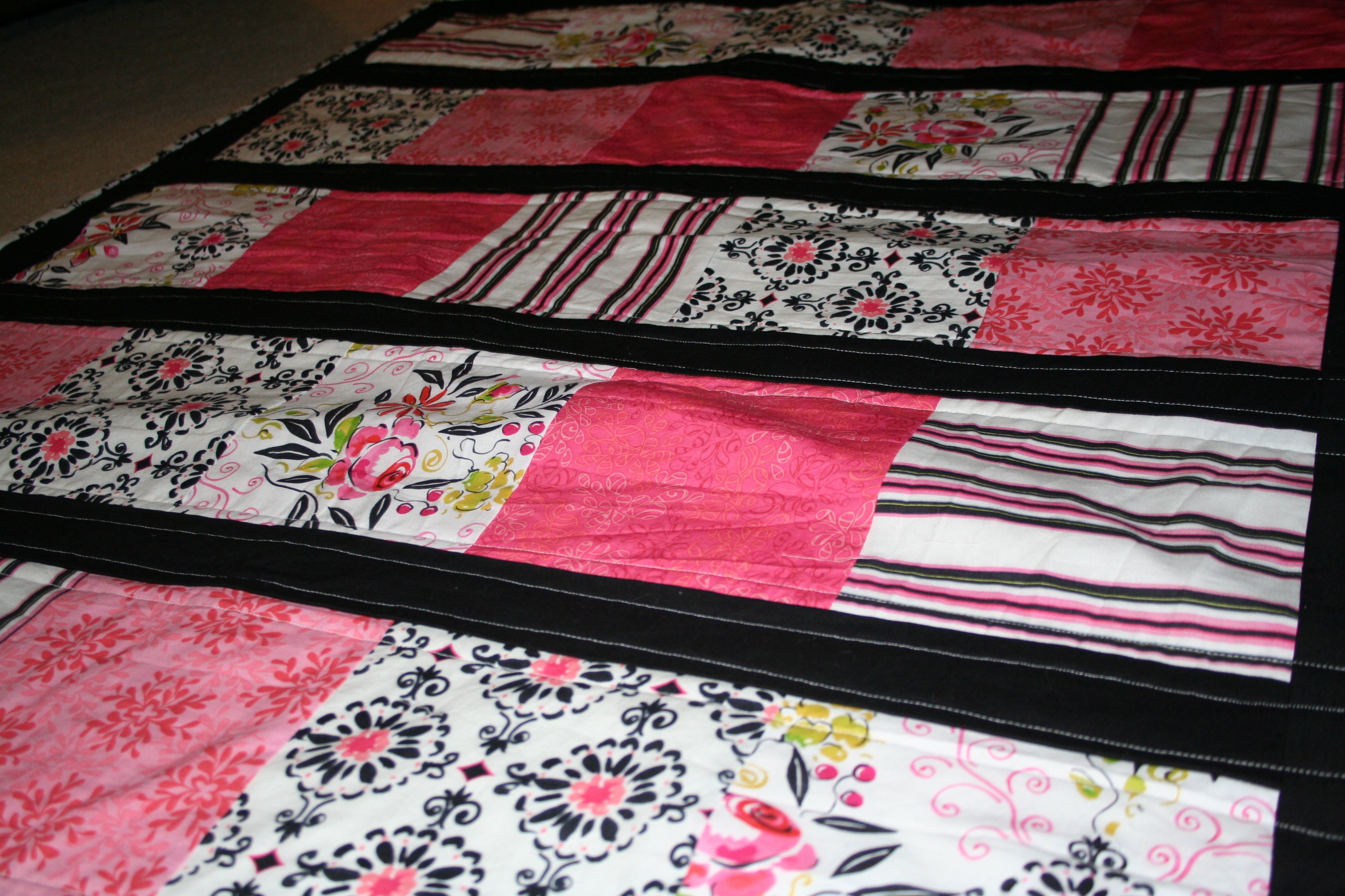 Apparently I took a bunch of good pictures when I finished and completely forgot about it. I am not usually a big fan of pink, but my client asked for pink and black, and I’m really thrilled with how chic the quilt came out.