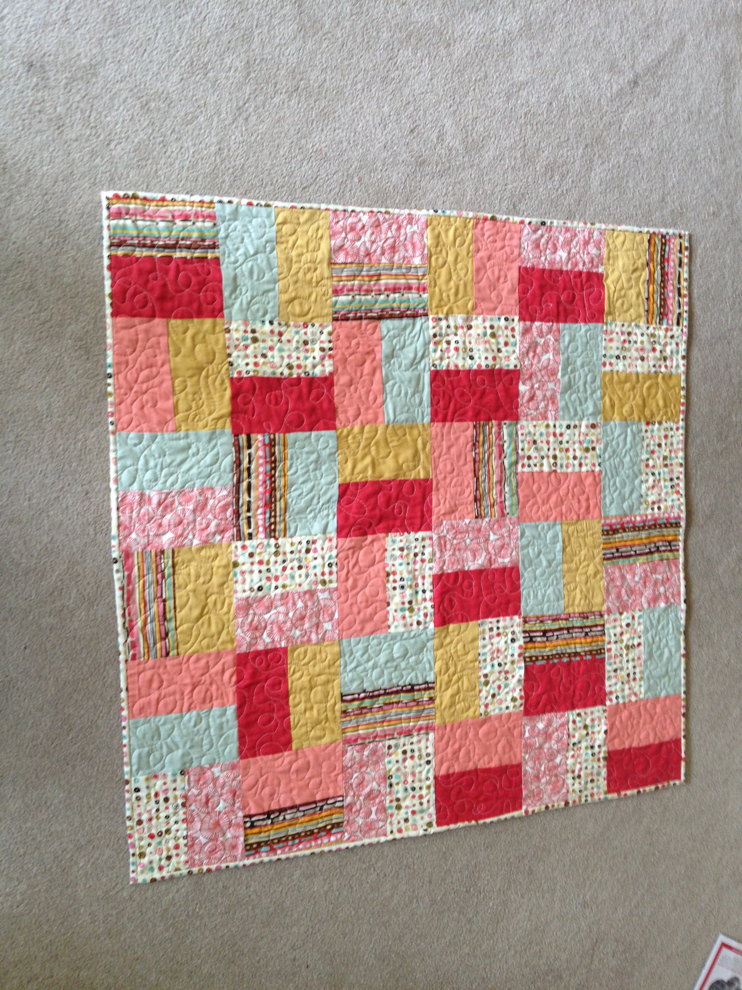 This quilt marked a huge milestone for me. It was my tenth, finished right around 6 months from when I first took sewing lessons and took off piecing, layering and binding. I started with a multi-colored polka dot print, pulling colors from it. The lovely Beth at my favorite fabric store (Rock Paper Scissors in Montclair) suggested using a red linen, and though I wasn’t sure about it, it turned out really well. I used the polka dots for the back and binding.