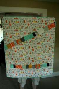 The first was for my second cousin’s second baby. I found these adorable prints with monsters playing and did a repeat of the Intersection pattern with some scraps from my stash.