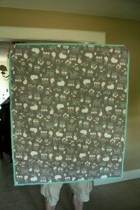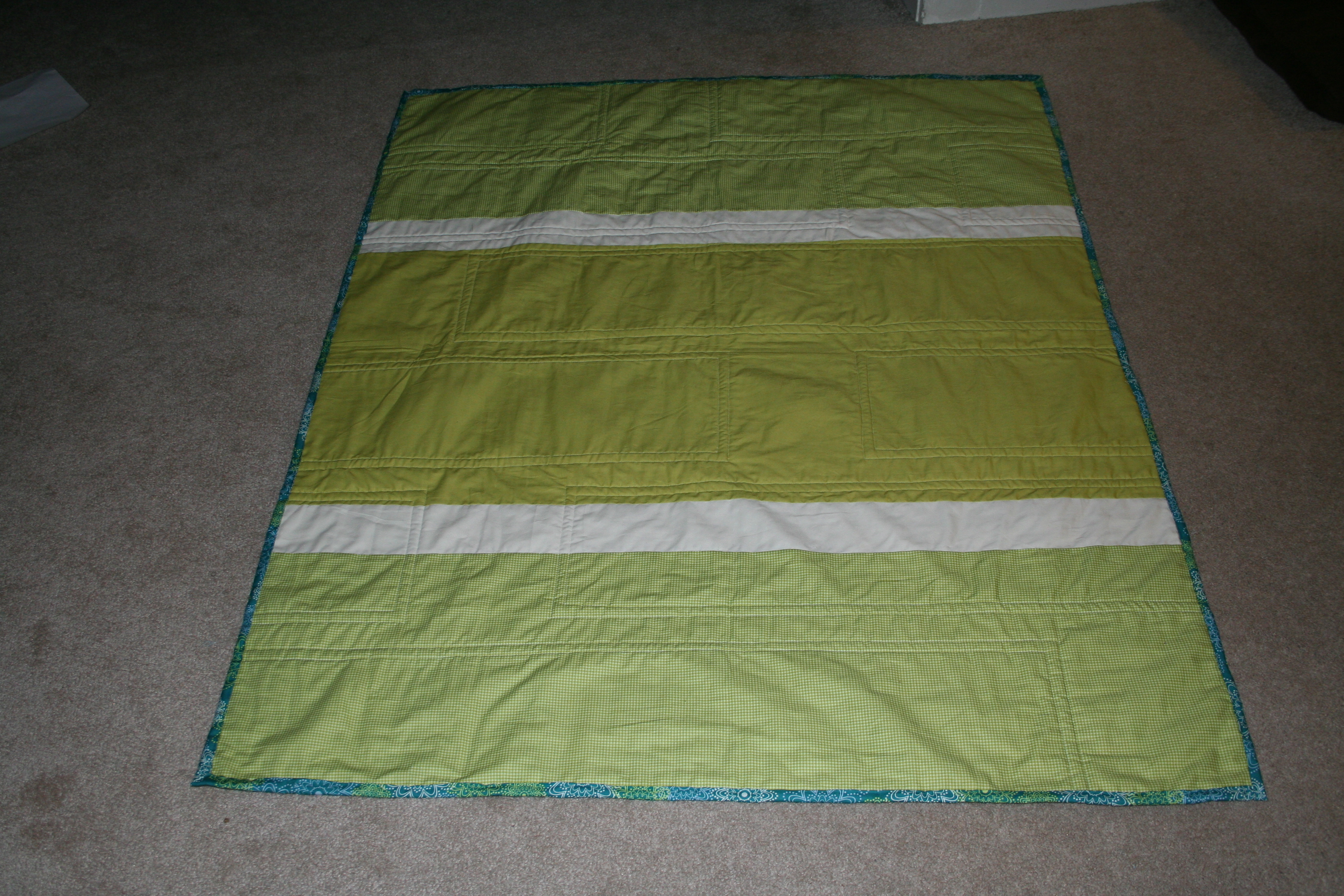 The second quilt was for another second cousin’s wife, and I went with more nature-themed fabric. I tried to make the white appear like a maze, but I’m not sure how successful it was. I think if the prints had been a bit bolder it would have been more obvious. But I like the peacock blue and lime green colors.