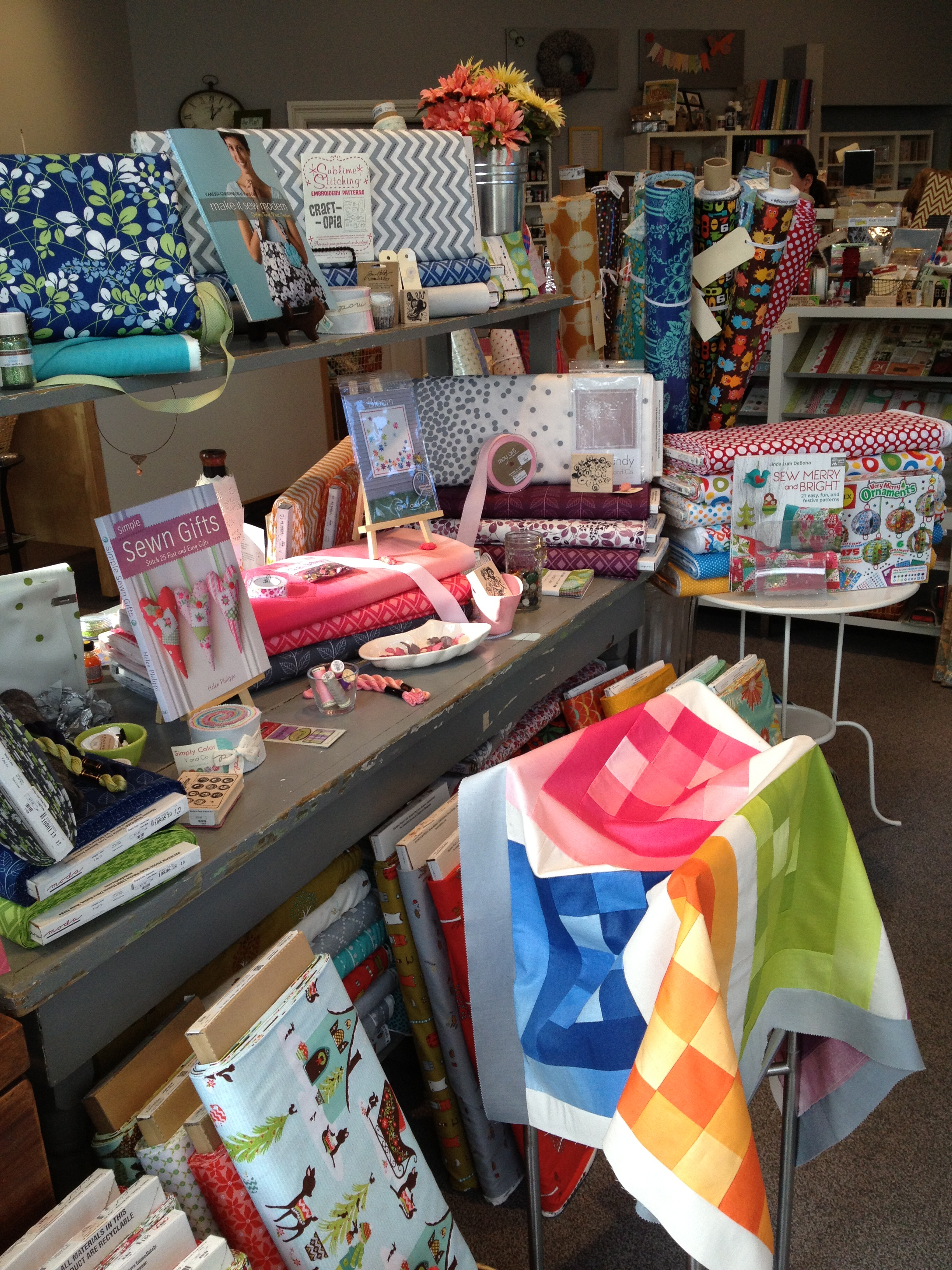 I have been so excited lately about a quilt partnership and milestone, and for no reason at all have neglected to mention it here. I designed a quilt for the local craft store, Rock Paper Scissors in Montclair NJ, to demonstrate some of the amazing things that can be done with the Simply Color fabric line. Just before the holidays I was literally trying not to jump up and down when I saw it in the store.