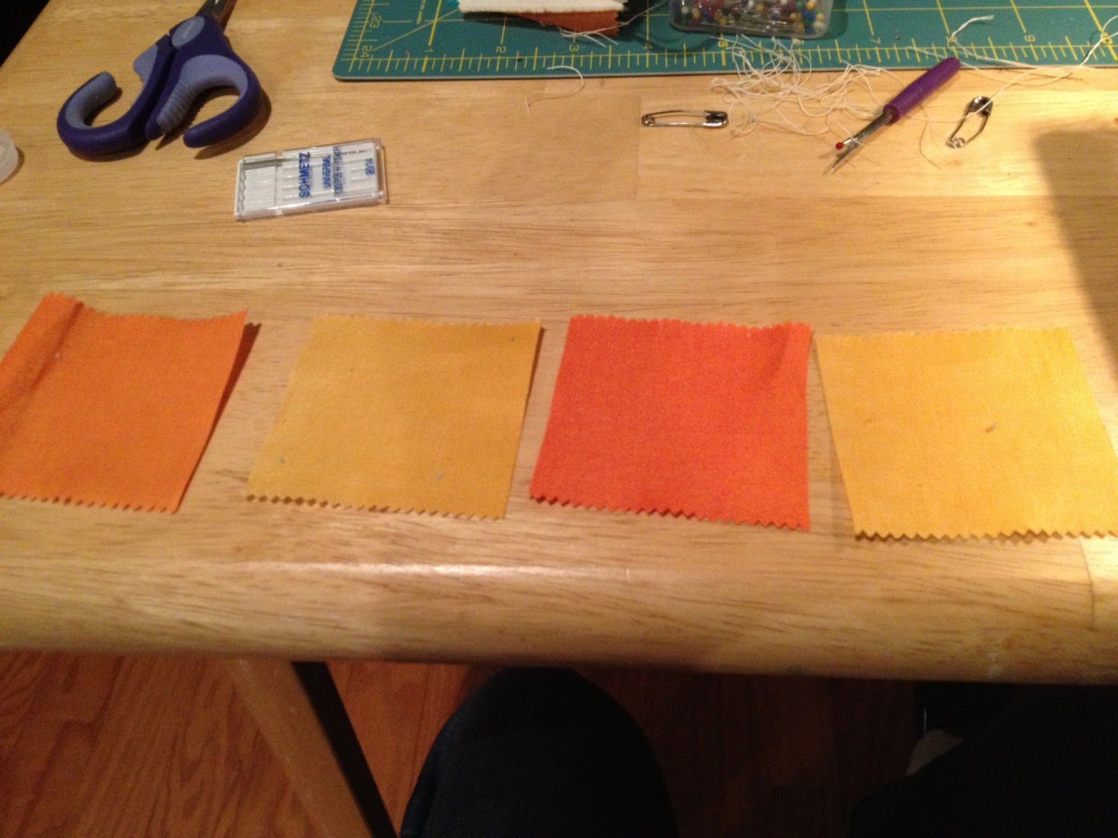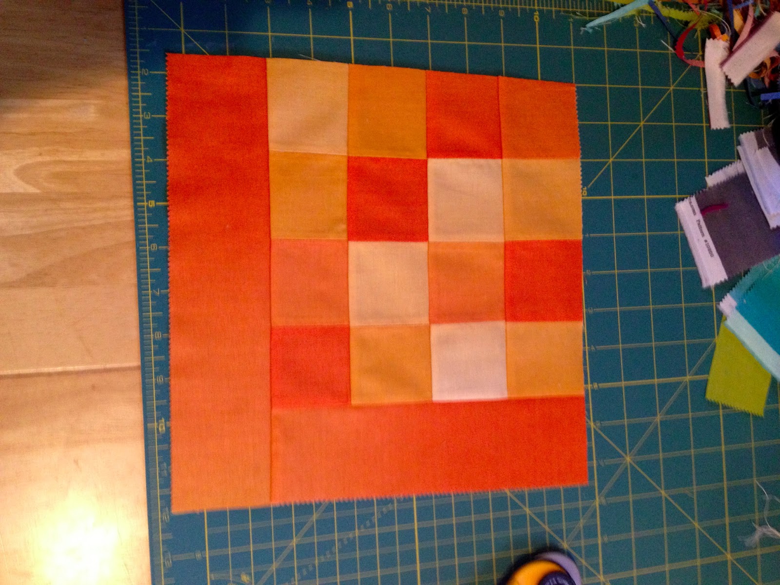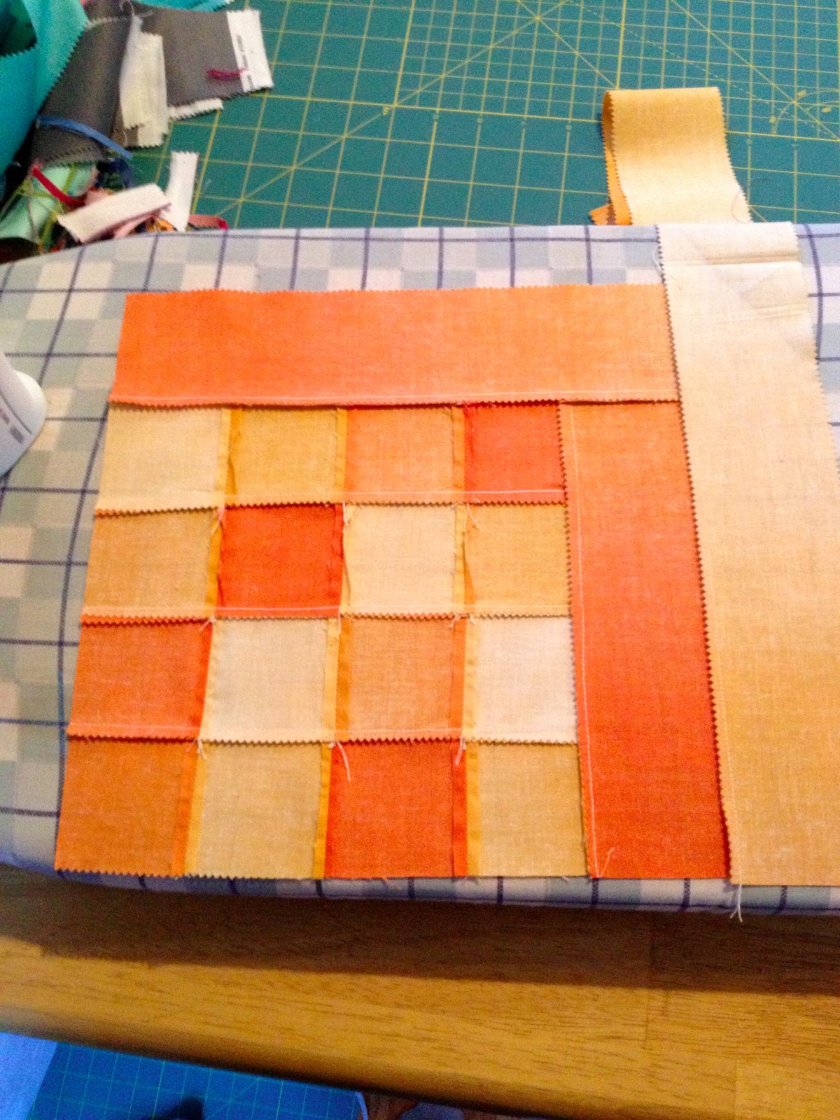 Next, pick a strip of each color to make the border angles. I used a log cabin technique, but only on two sides of each block.
