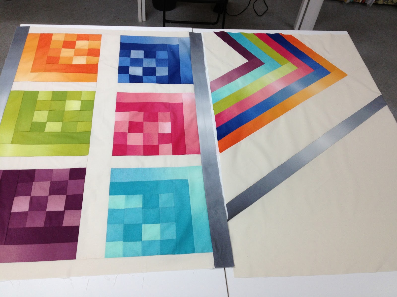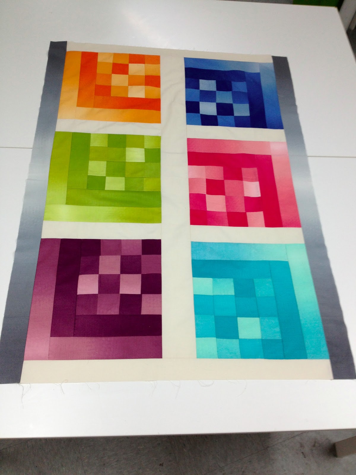 Finally, take two of the gray ombre strips and sew them to the vertical edges of the quilt top. Press, admire and set aside for later.