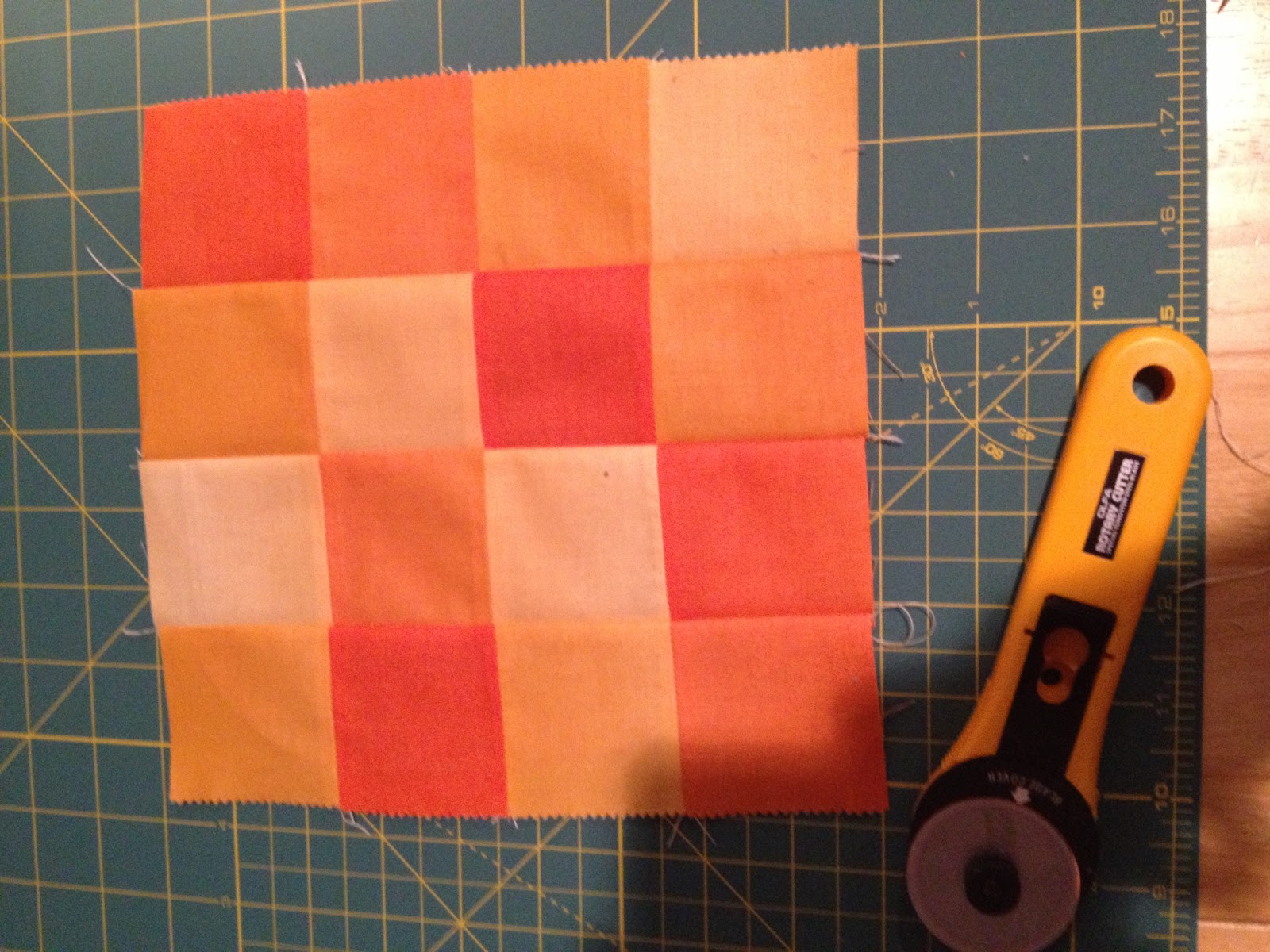 First, take a strip and cut it into 16 2.5 inch squares. (Each strip should yield 17 squares, so you can pick your favorite 16.) Arrange them in a way that mixes light and dark squares and sew into four rows of four squares each. Press.
