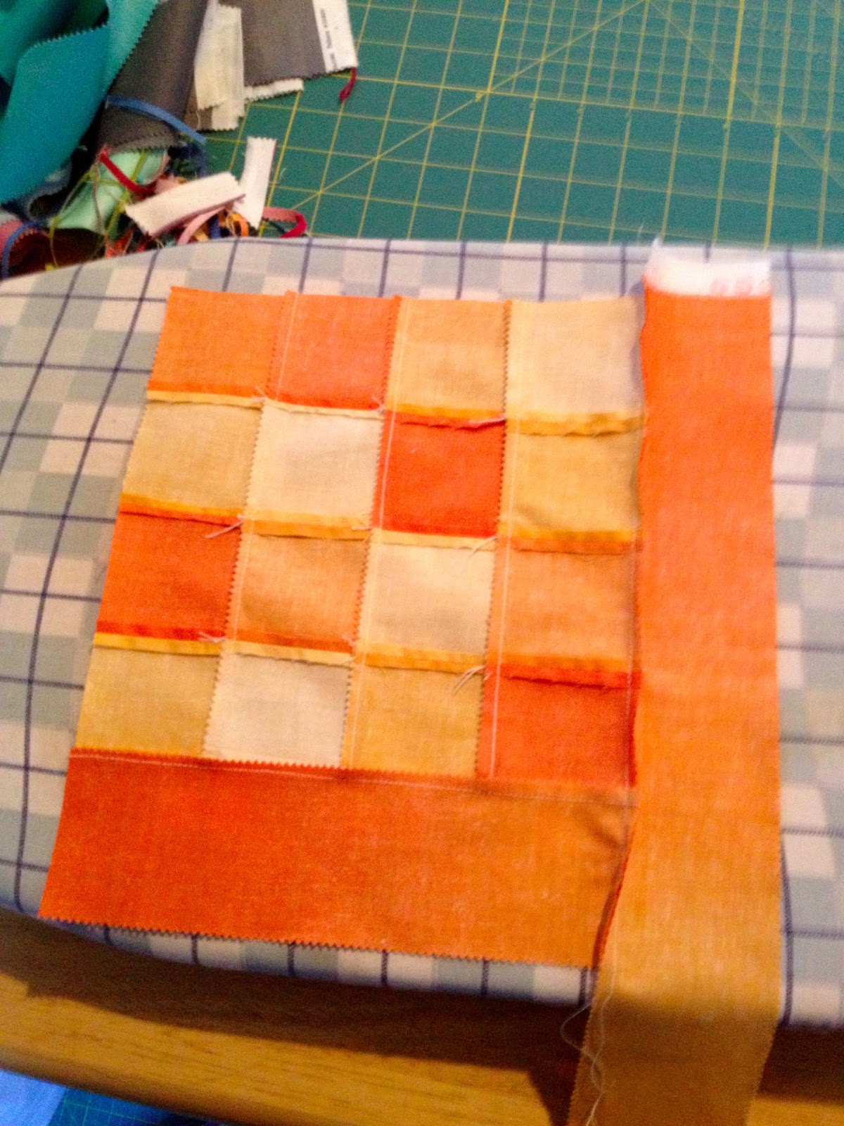 Line up one of the saturated ends to the patchwork block of the same color, pin and sew it to the side of the block. Don’t cut the strip until you’ve sewn it, and try not to stitch far past the blocks onto the strip– you’ll be trimming as you go.
