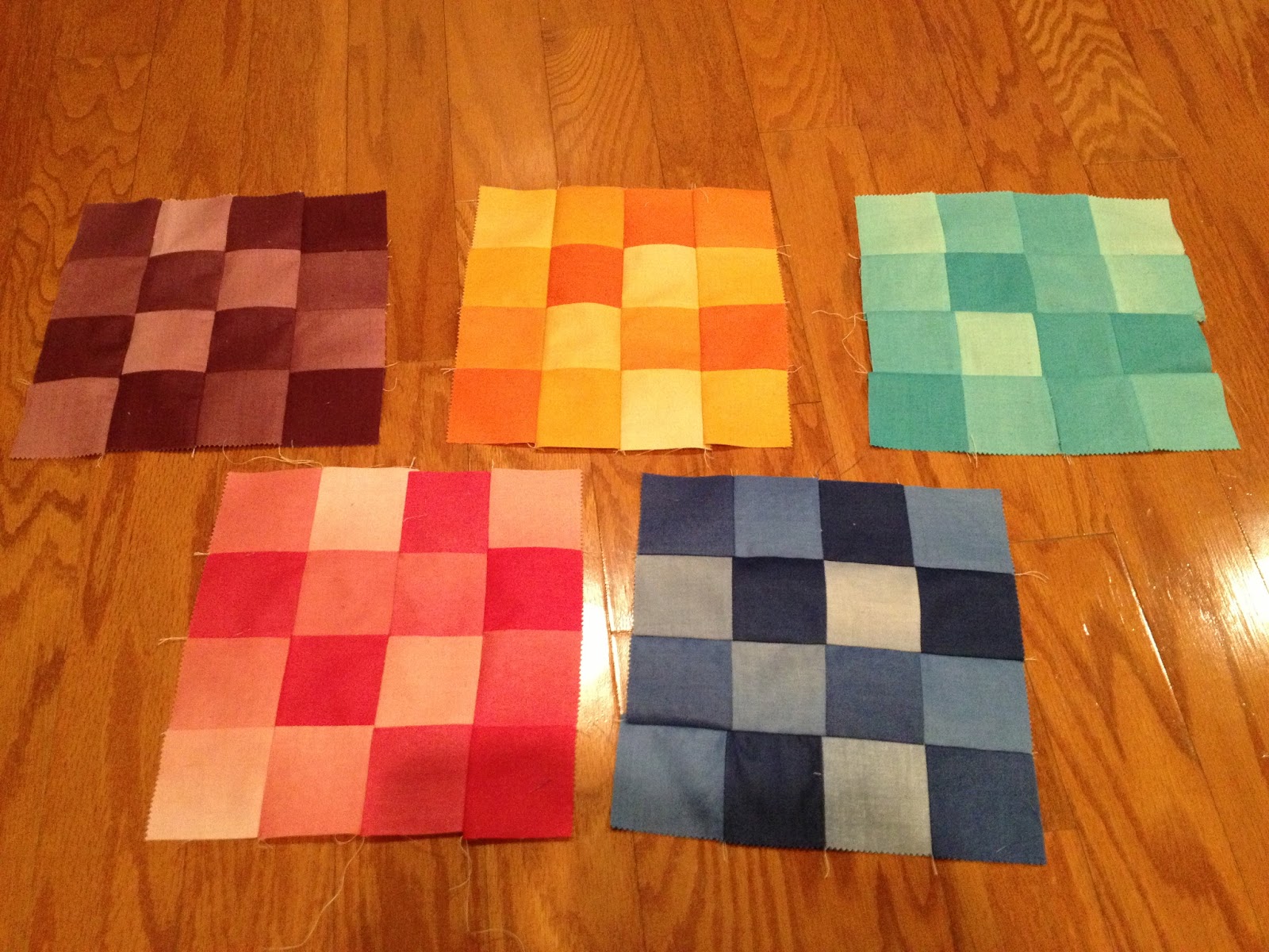 Next, pin and sew your rows together to make a block. Repeat for each color. Press. You should have six 8.5 inch squares. Repeat for each color.