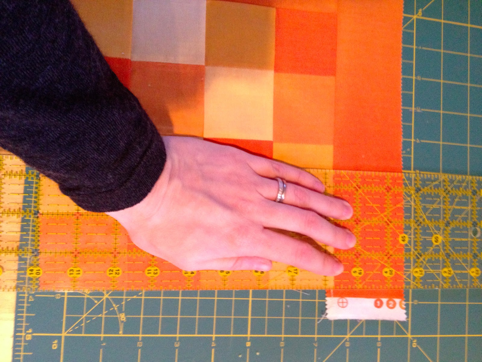Return to the first side, lining up the lightest part closest to the corner where the strips meet. Press and cut.