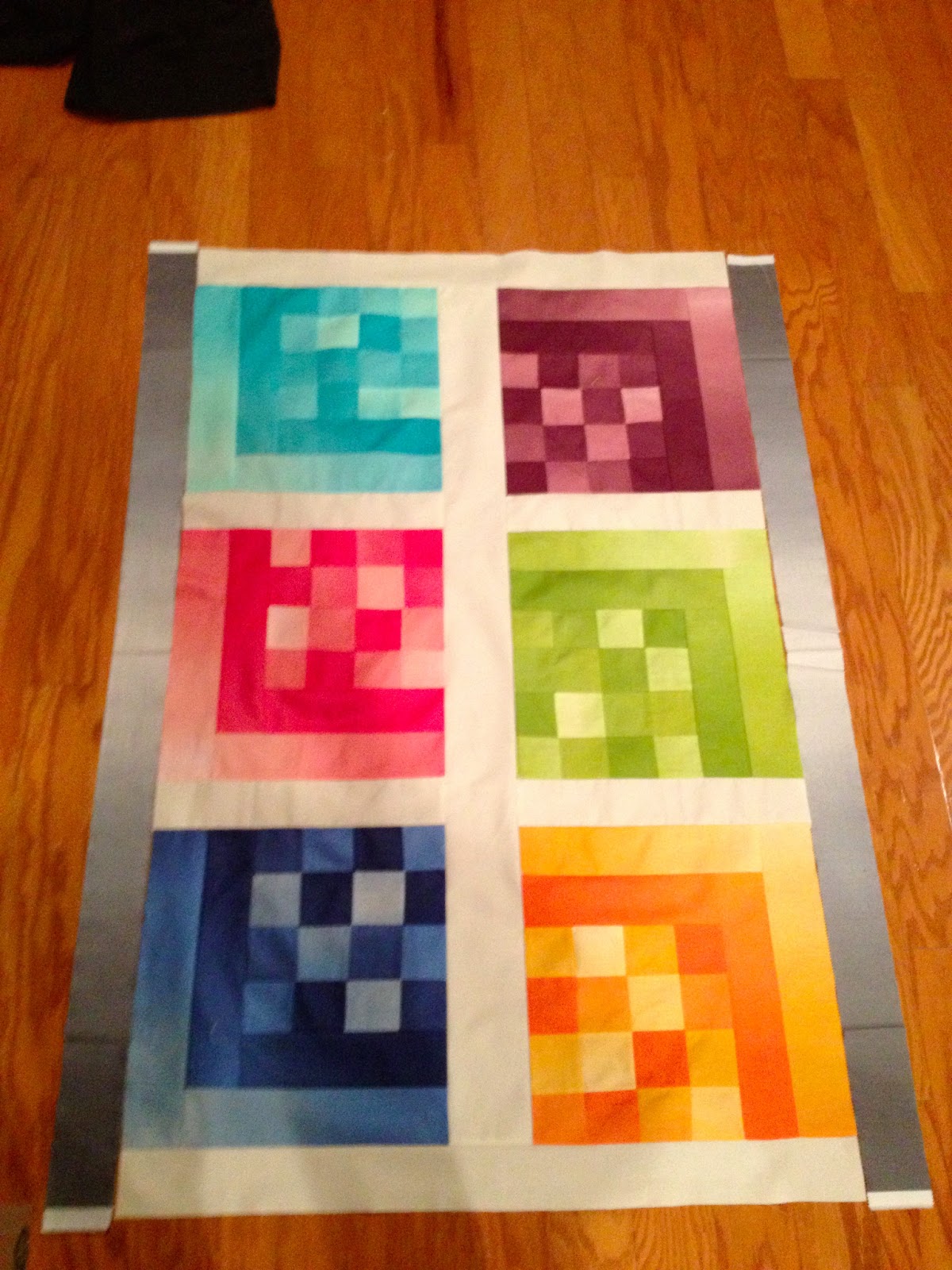 For the back, I used a more improvisational style. I cut a ten inch square of neutral solid and used the ombre corner technique to make right angles with the remaining color strips (one of each color), keeping the strips long. I regularly laid the back over the top to make sure that the ends would cover the back, and also that the positioning was the way that I had envisioned. (Obviously, never trim the backing when it is resting on the top. I didn’t do it this time around, but sometimes when I get in the quilting zone, I make mindless mistakes.)
