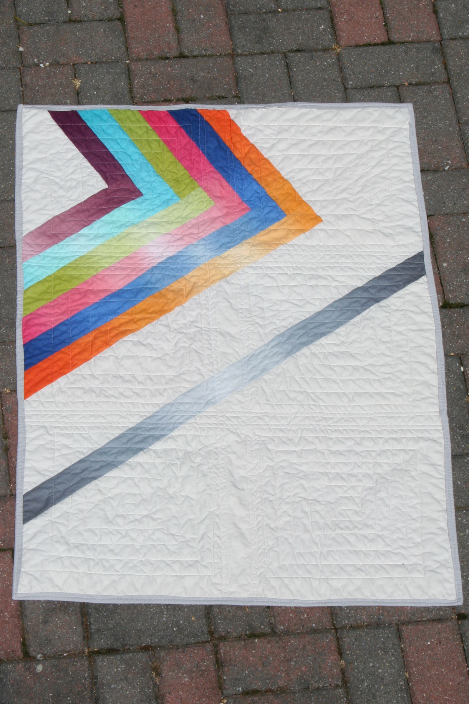 For those who don’t know the whole story, this quilt was made as a sample for Rock Paper Scissors using a mini jelly roll of ombre fabric from the Simply Color line and about two yards of Kona Bone. The binding is Kona Medium Grey. I was inspired by Amy Smart’s ombre quilts and Alissa Haight Carlton’s Pink Greater Than.
