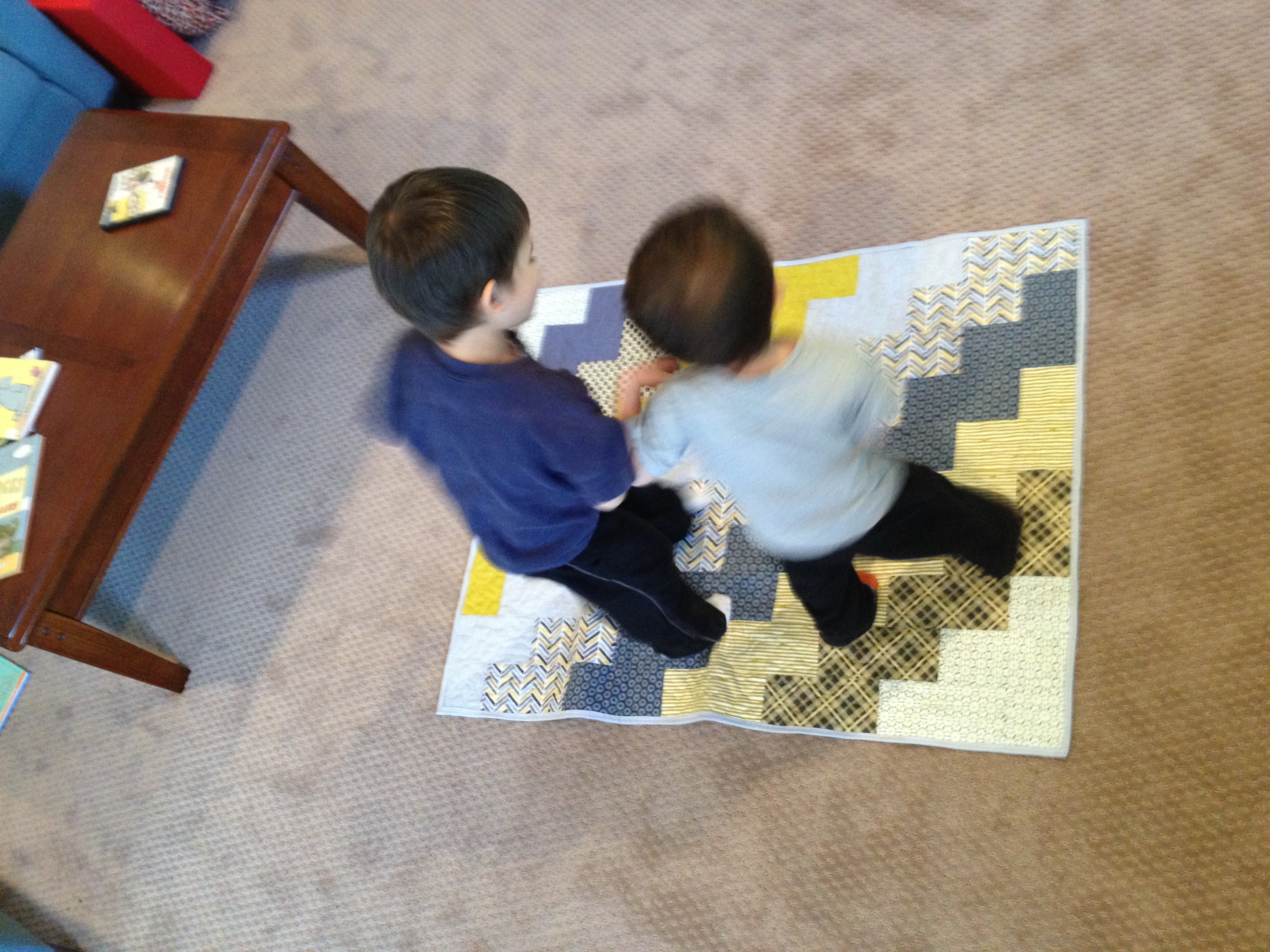 Every time I finish a quilt, especially a gift for friends, I show it to my boys and they ask, “Can we dance on it?”