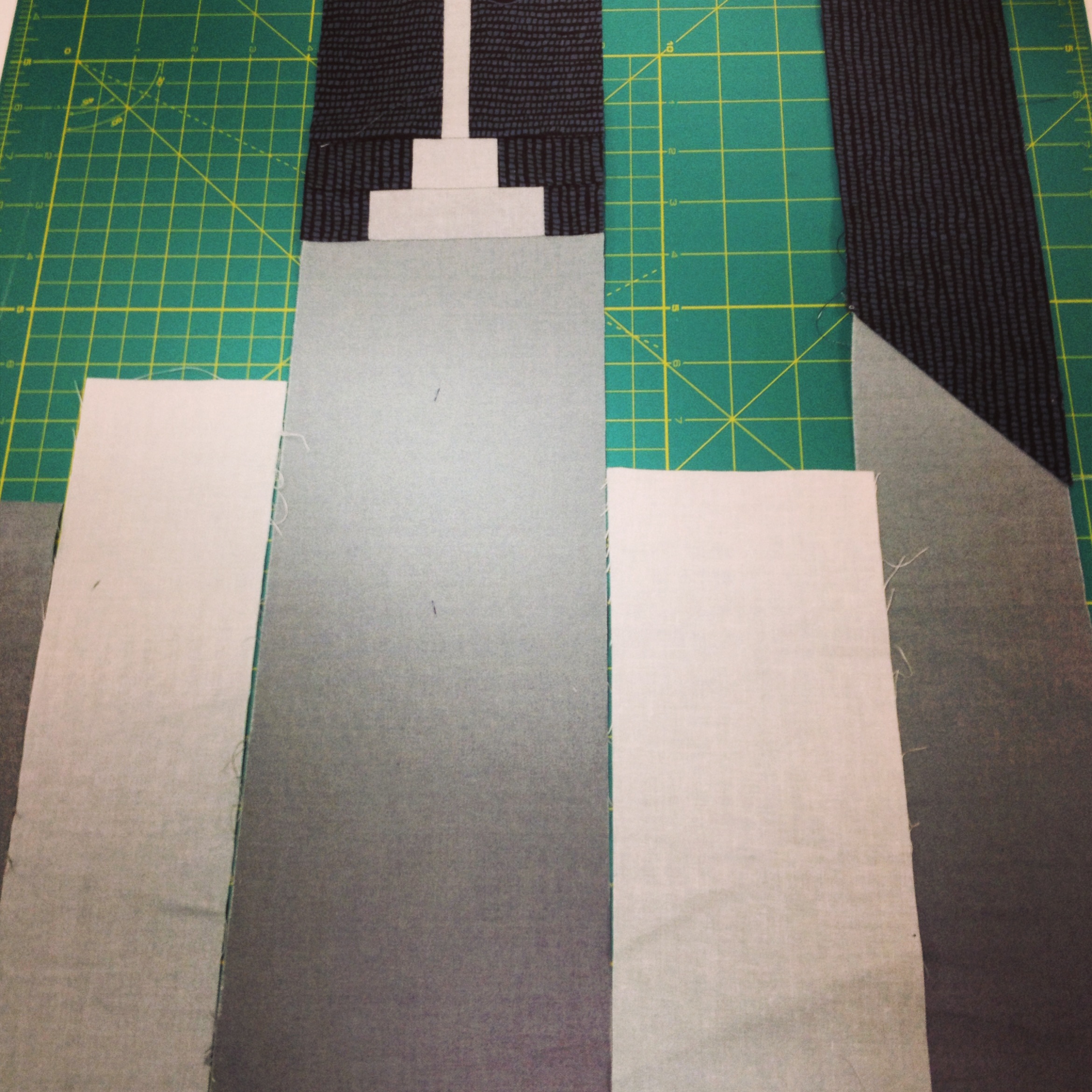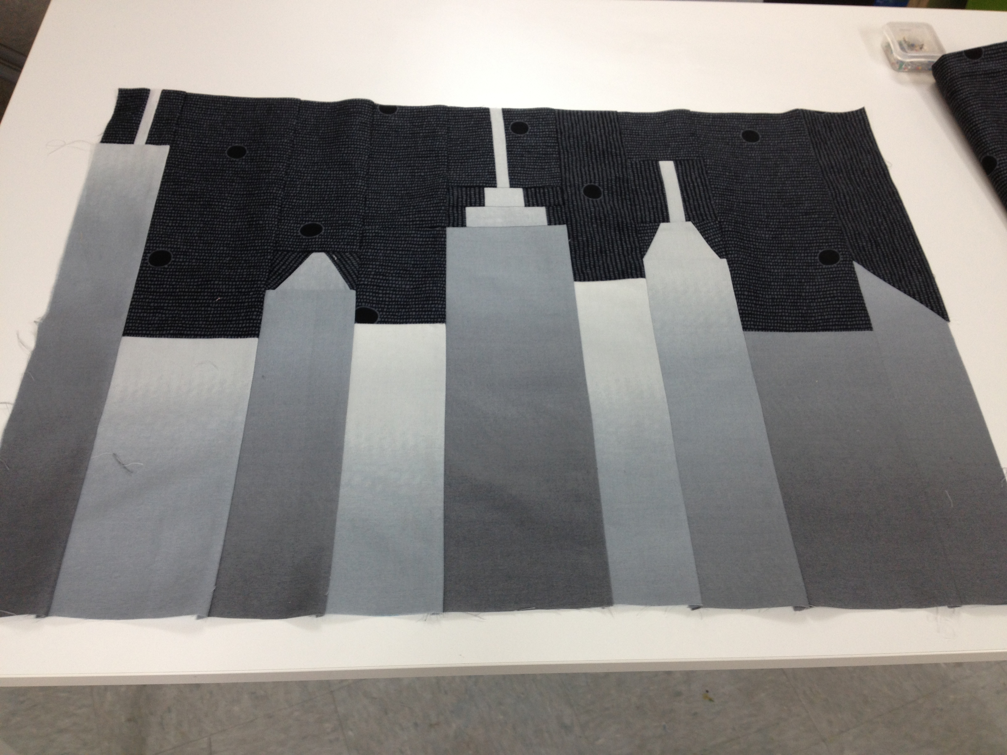 The tiny pieces in each buildings are a little time consuming, so I was happy to get it all done in one sewing session. The sky is Chicopee Ladder Dot and the buildings are from some Simply Color ombre yardage.