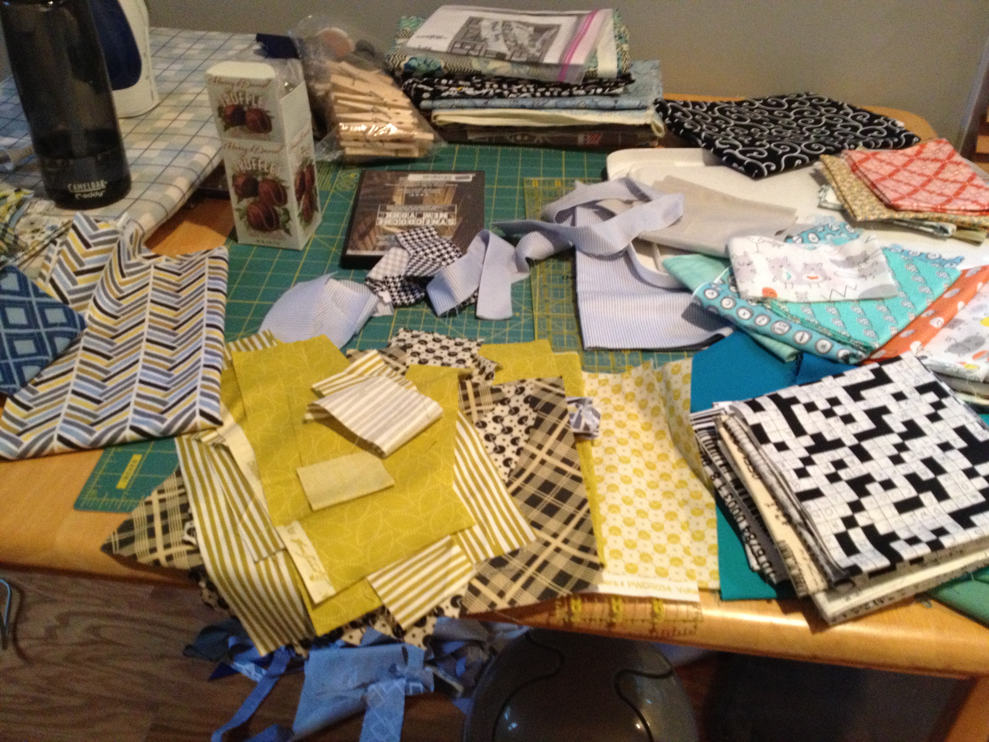 Today I am playing with fabric to figure out a design for another new baby. This is what my workspace looks like.