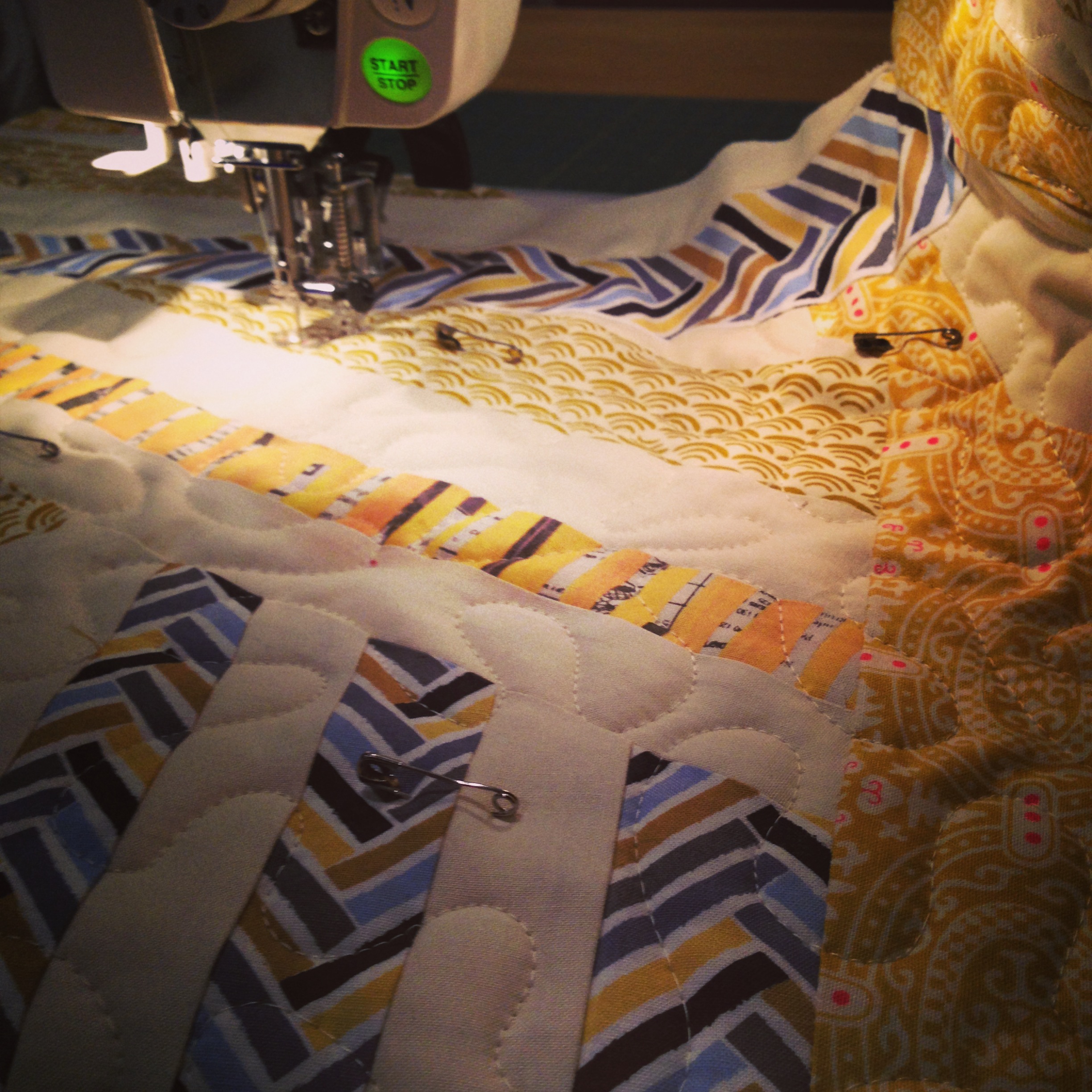 Thanks too to everyone who encouraged me to keep playing with the gold stripes as I improvised a mini quilt for a body pillow cover. It was so fun to just position and sew without thinking or planning too much. Here’s where I got as of Saturday night: