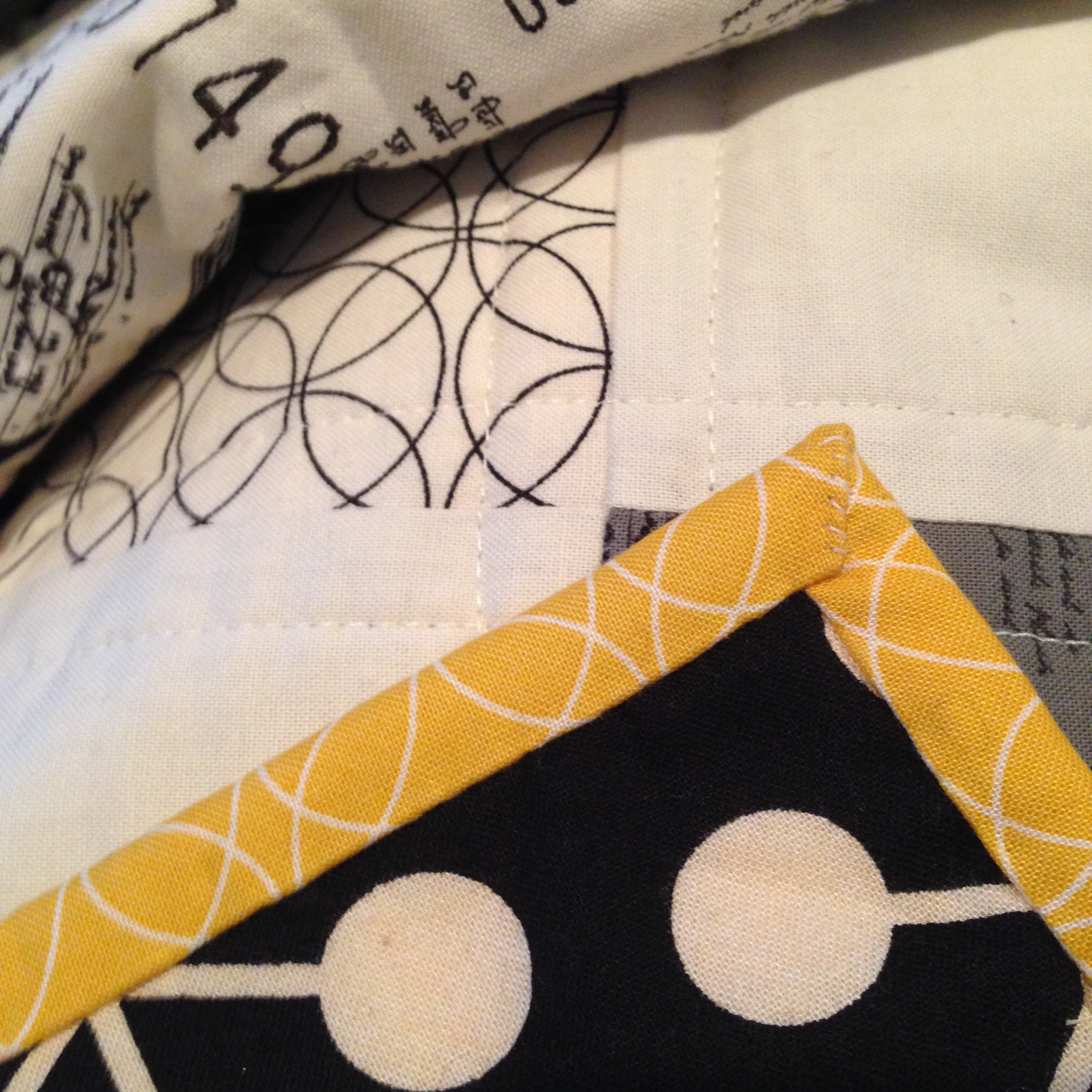 I quilted it in a grid about 3/8″ on either sides of the seams and hand-sewed the binding to the back.
