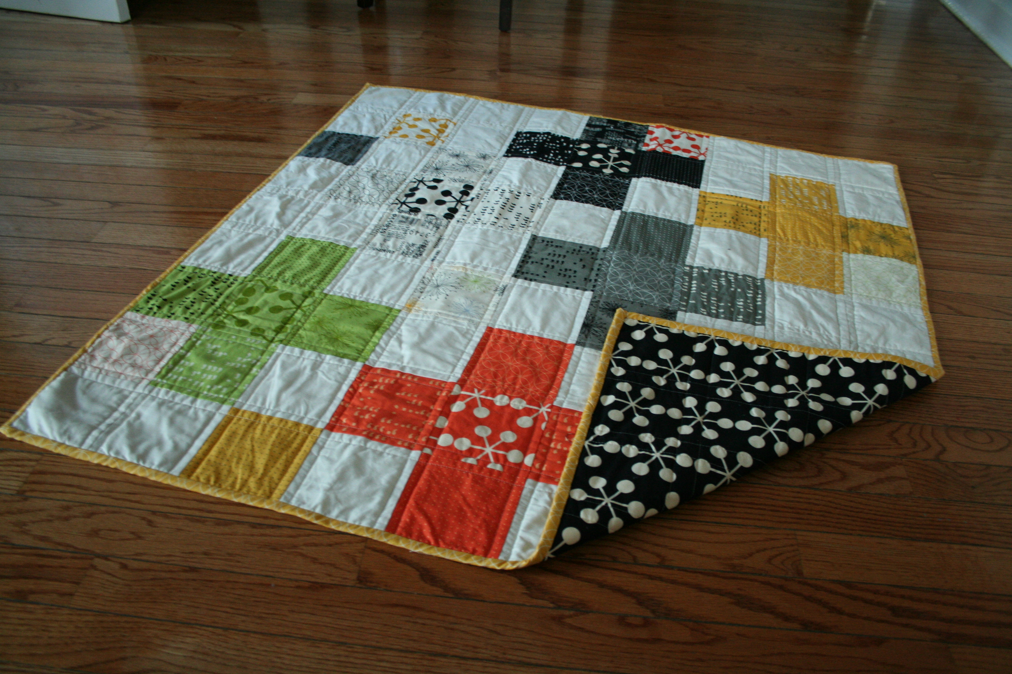 It’s the perfect learning quilt because it has just enough difficulty to be challenging (matching seams in patchwork, grid quilting, hand-made binding) but it’s got enough fun features to make the process quicker (pre-cuts, manageable size). It’s a great size for a Learning quilt, and it’s also a good size for a baby gift.
