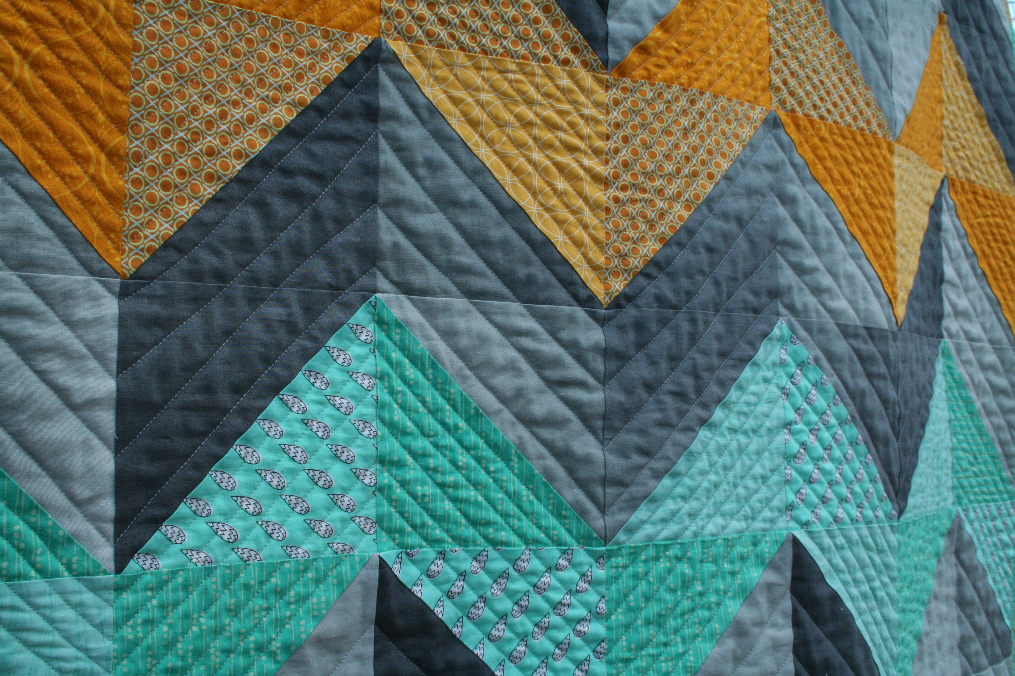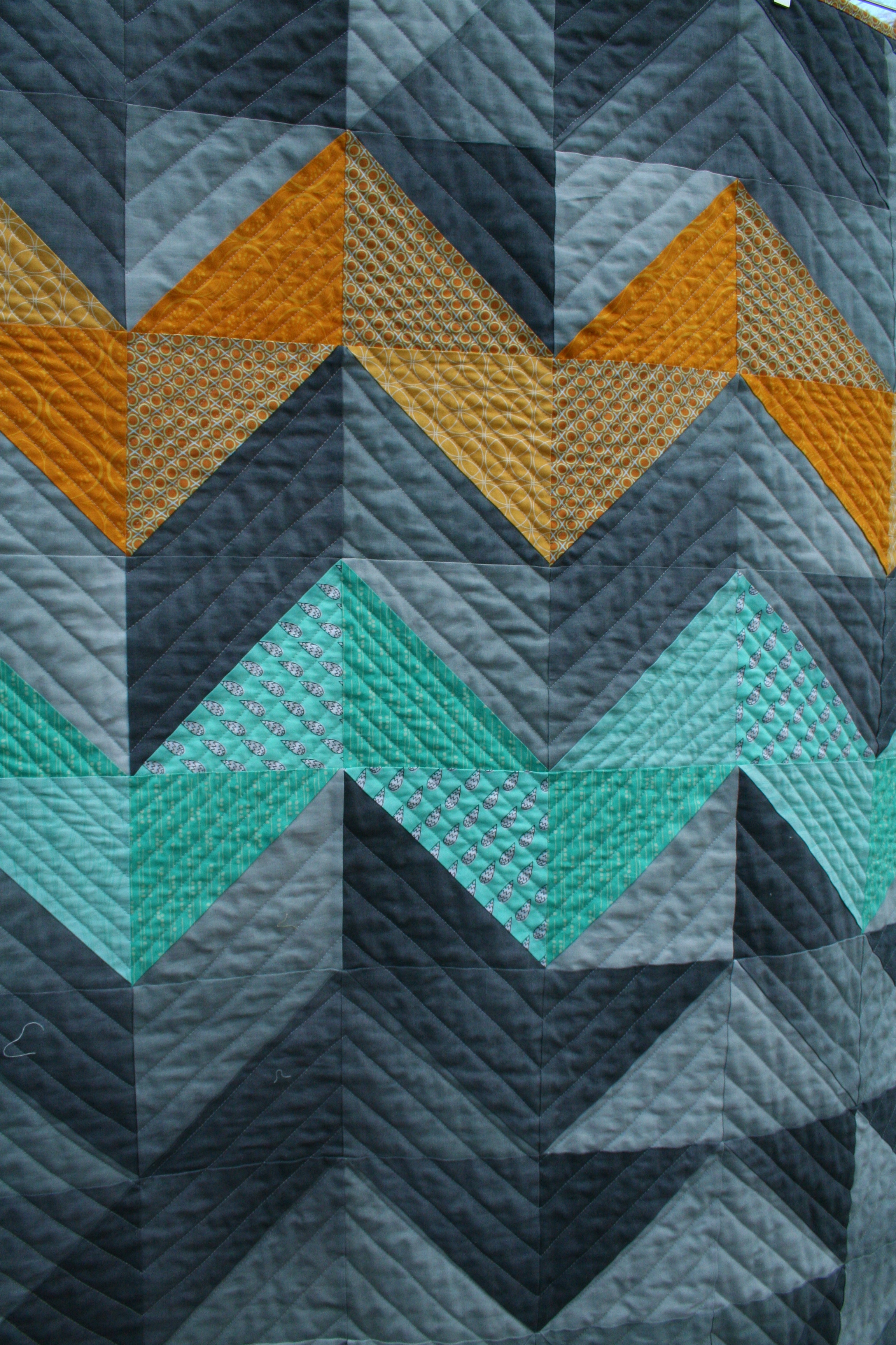 The quilting is echo zigzags about an inch apart. I made the lines more dense inside the chevrons.