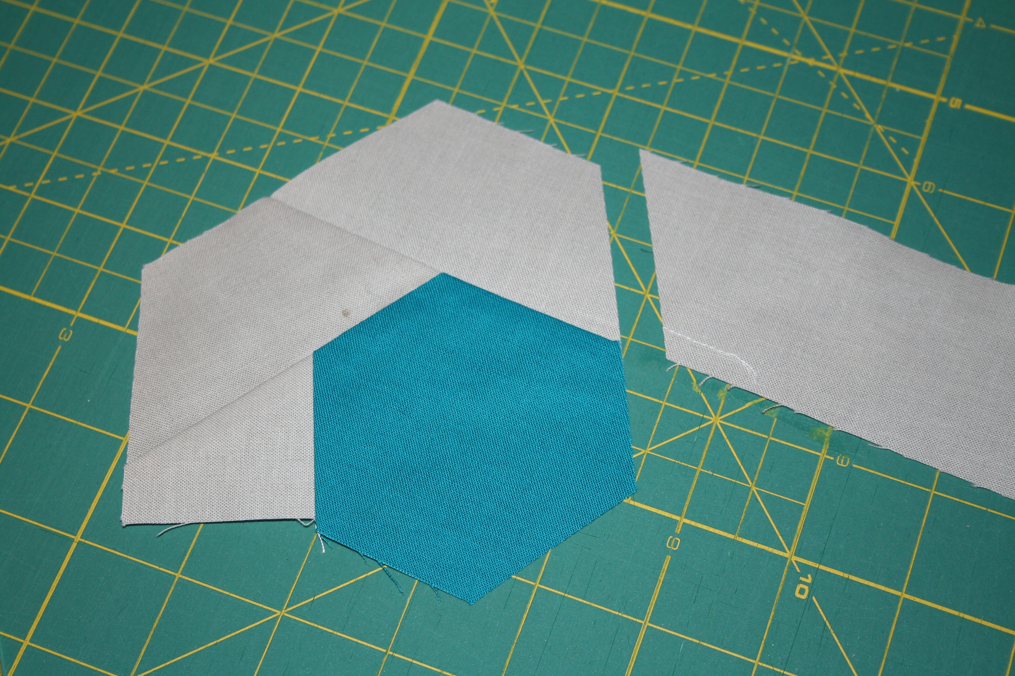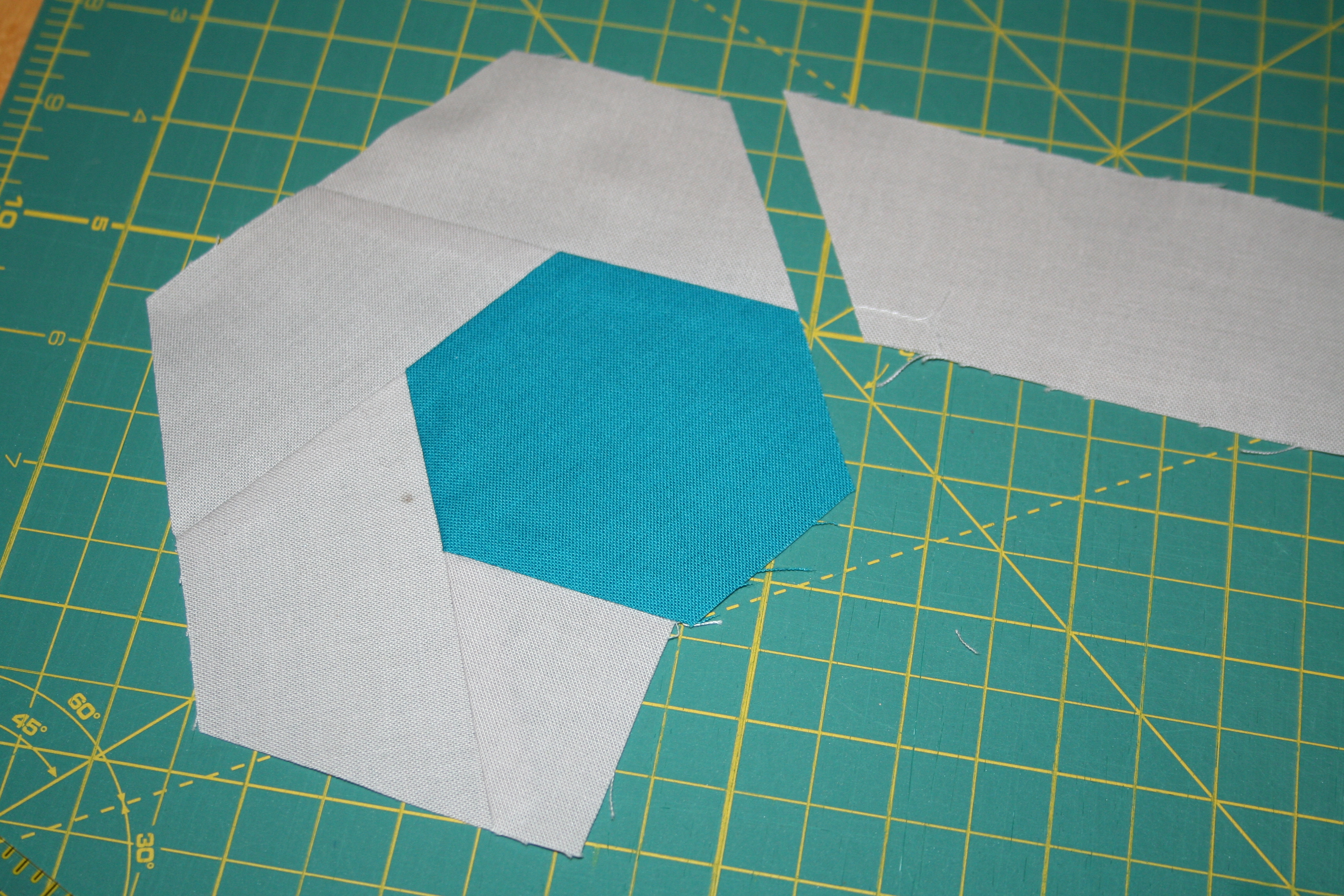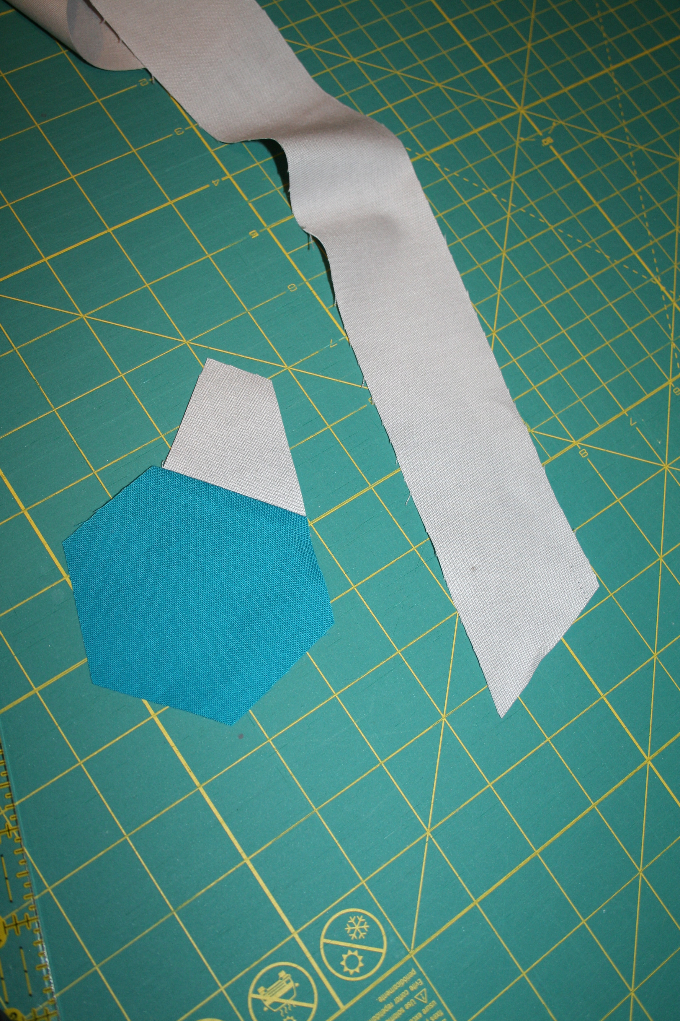 Sew the strip to one side of the hexagon. Make sure that the strip corner is in line with or higher than the hexagon corner (this picture shows it a smidge too low). We need to be sure that there will be enough fabric to make a straight line when trimming the short end of the strip before the last side is sewn.