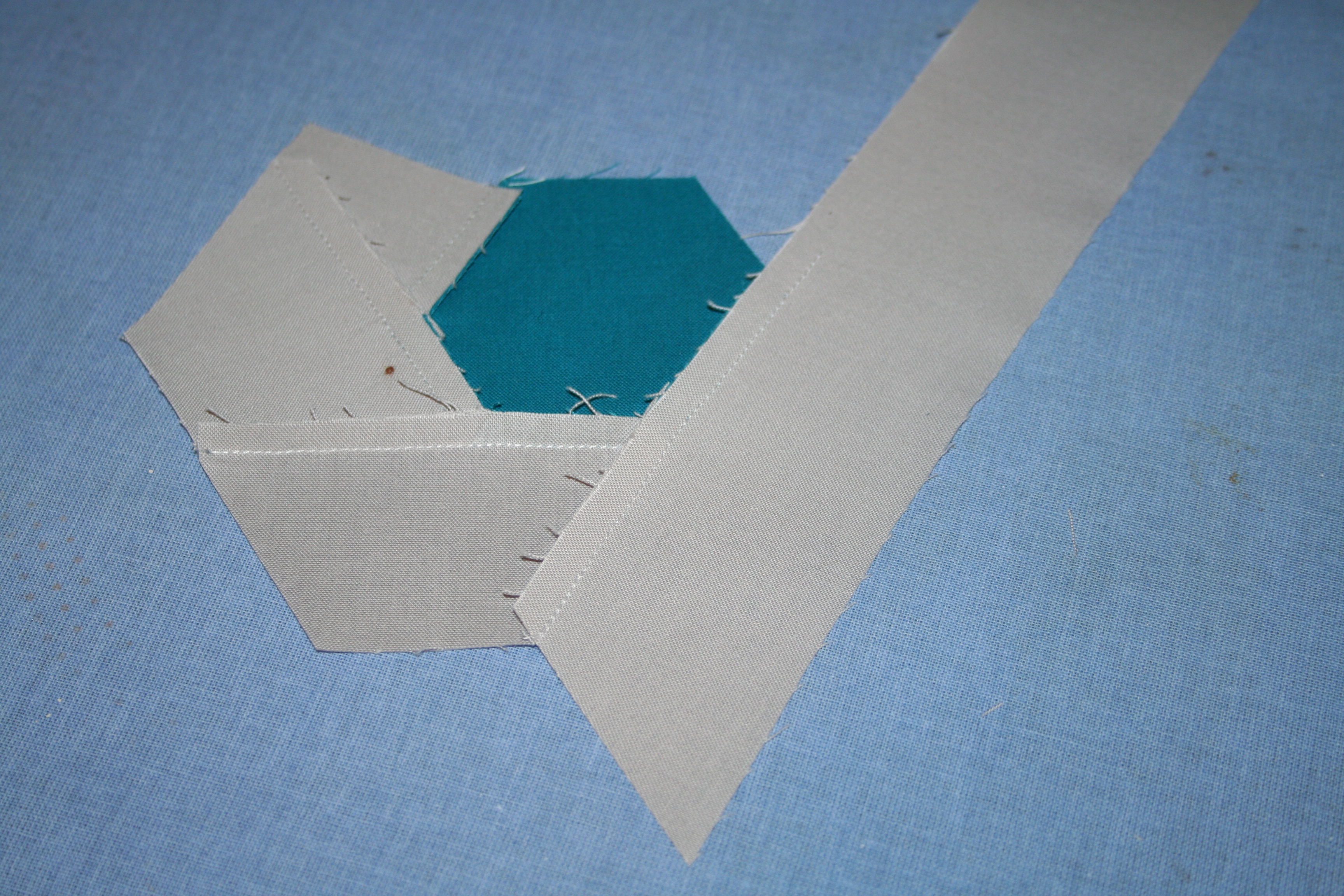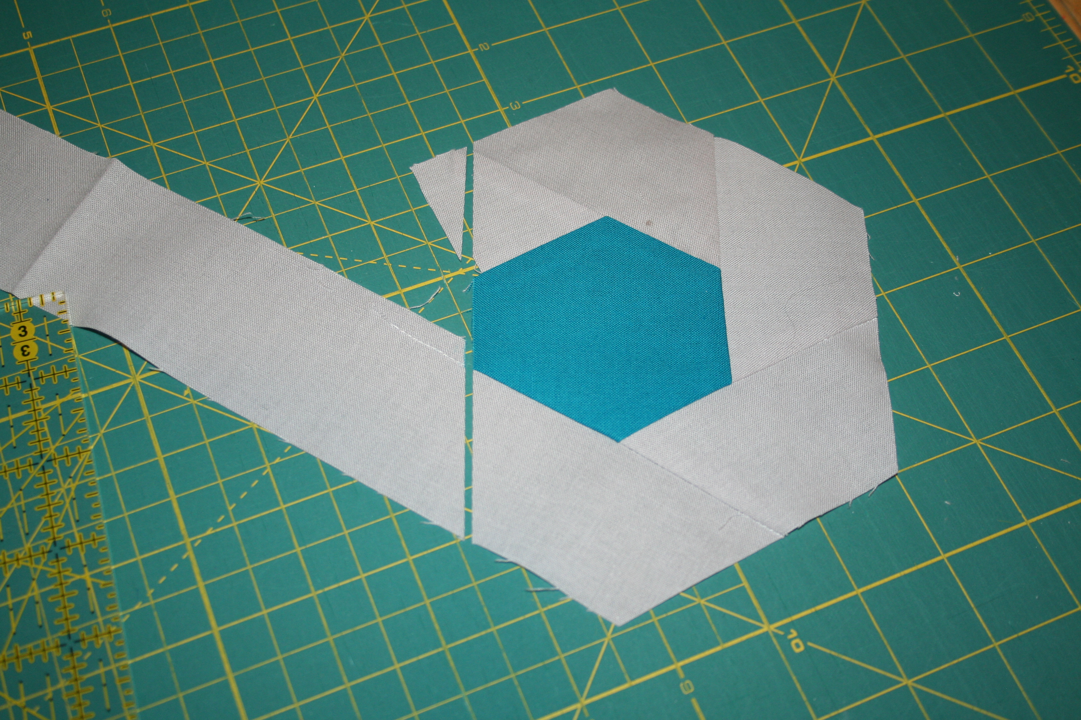 The cut before the last side is sewn is one straight line. See how my strip was just a little shy of the corner? That ends up in the seam allowance, but ideally would be flush with the side of the hexagon.
