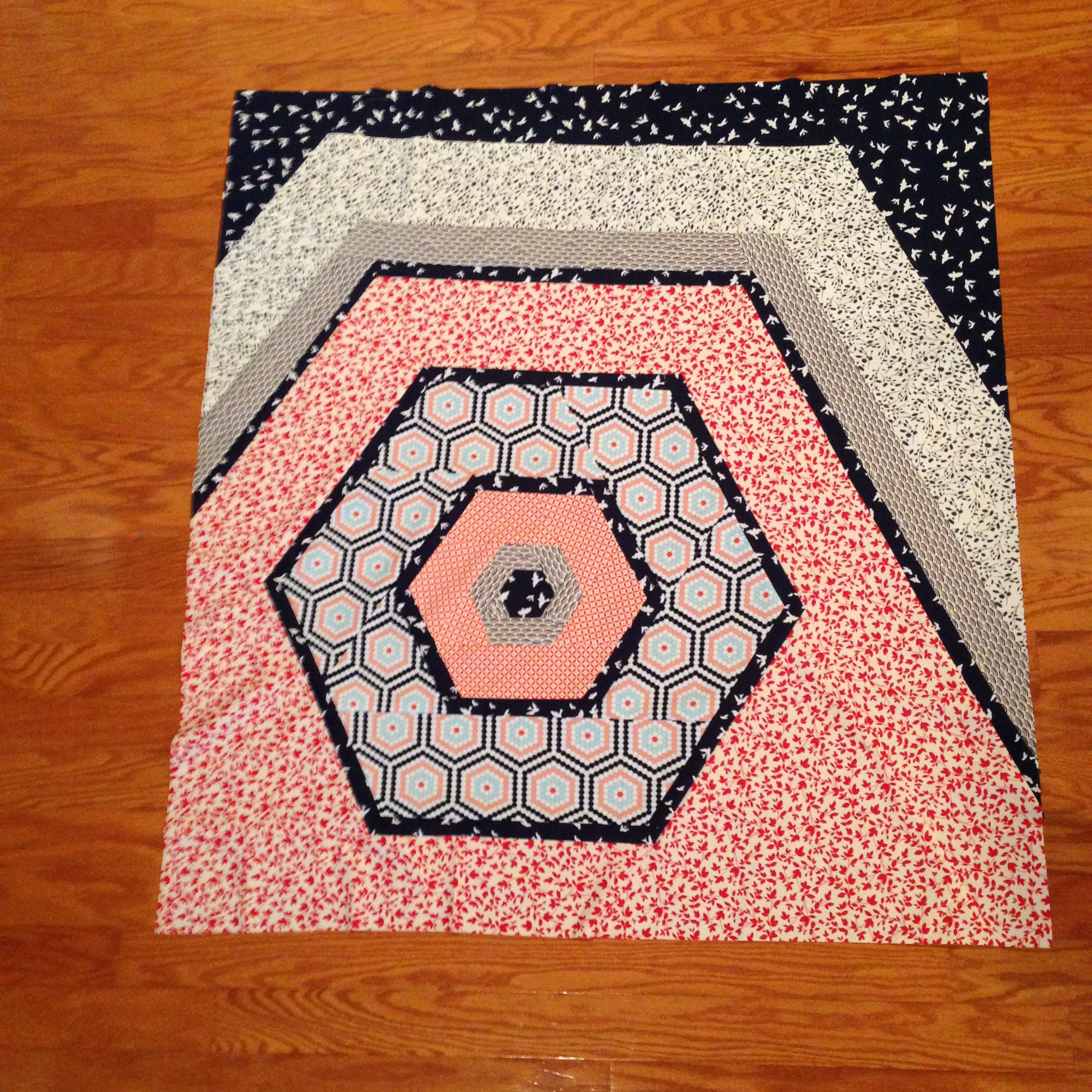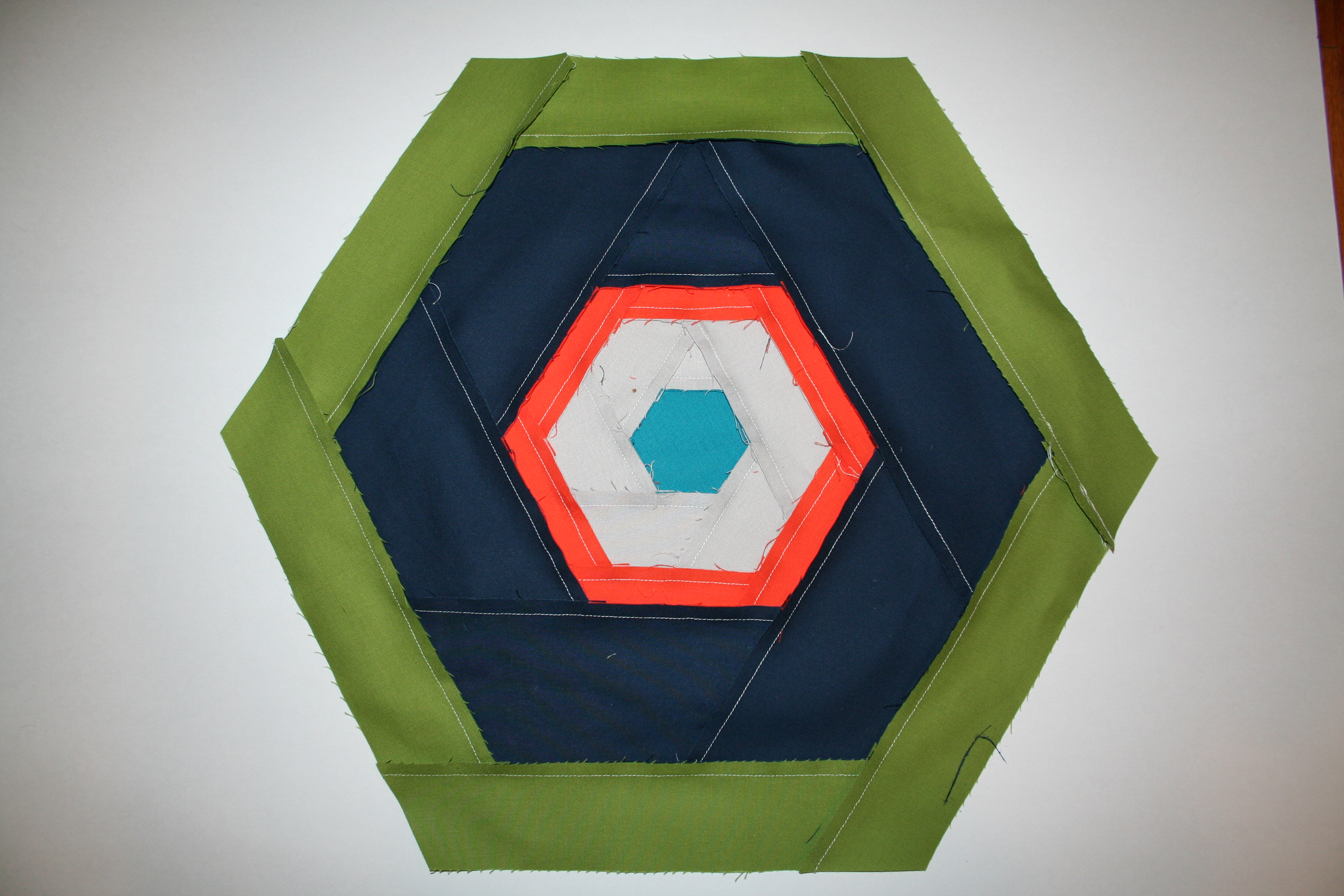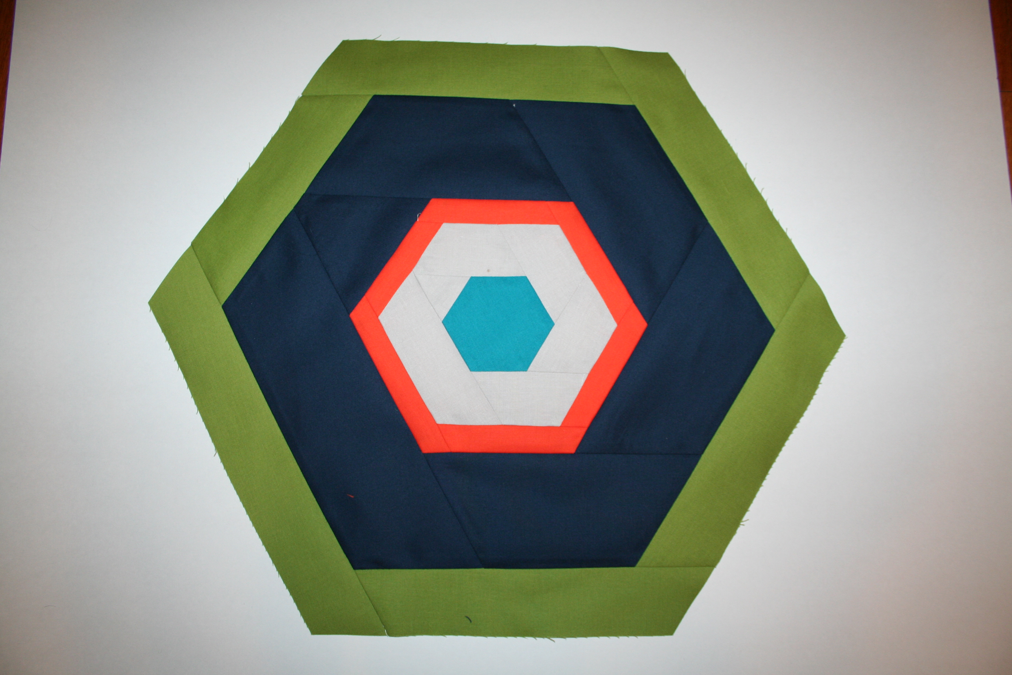 I’ve been wanting to make a hexagon quilt for a long, long time, but I’m not a huge fan of repetitive piecing or hand-stitching. I wracked my brain for a long time about how I could make hexagons my way. I thought about concentric hexagons in one giant design, and last Thursday I made it happen to very satisfying results.
