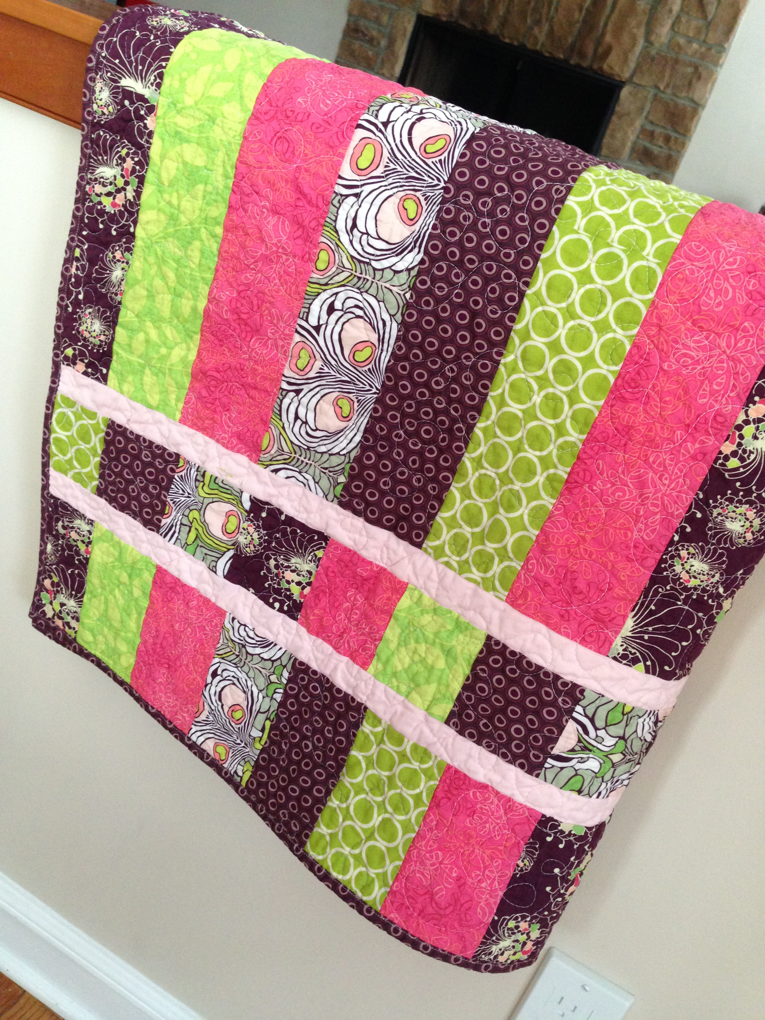 This weekend I quilted and bound a top that I’ve had in my closet for awhile for a fundraiser at my munchkins’ school. It was a rare quick finish and therefore very gratifying. The preschool is part of the Y family, and they raise money each year for a scholarship fund that helps families in need with childcare, camp and services. We’re going to do a tricky tray-style raffle.