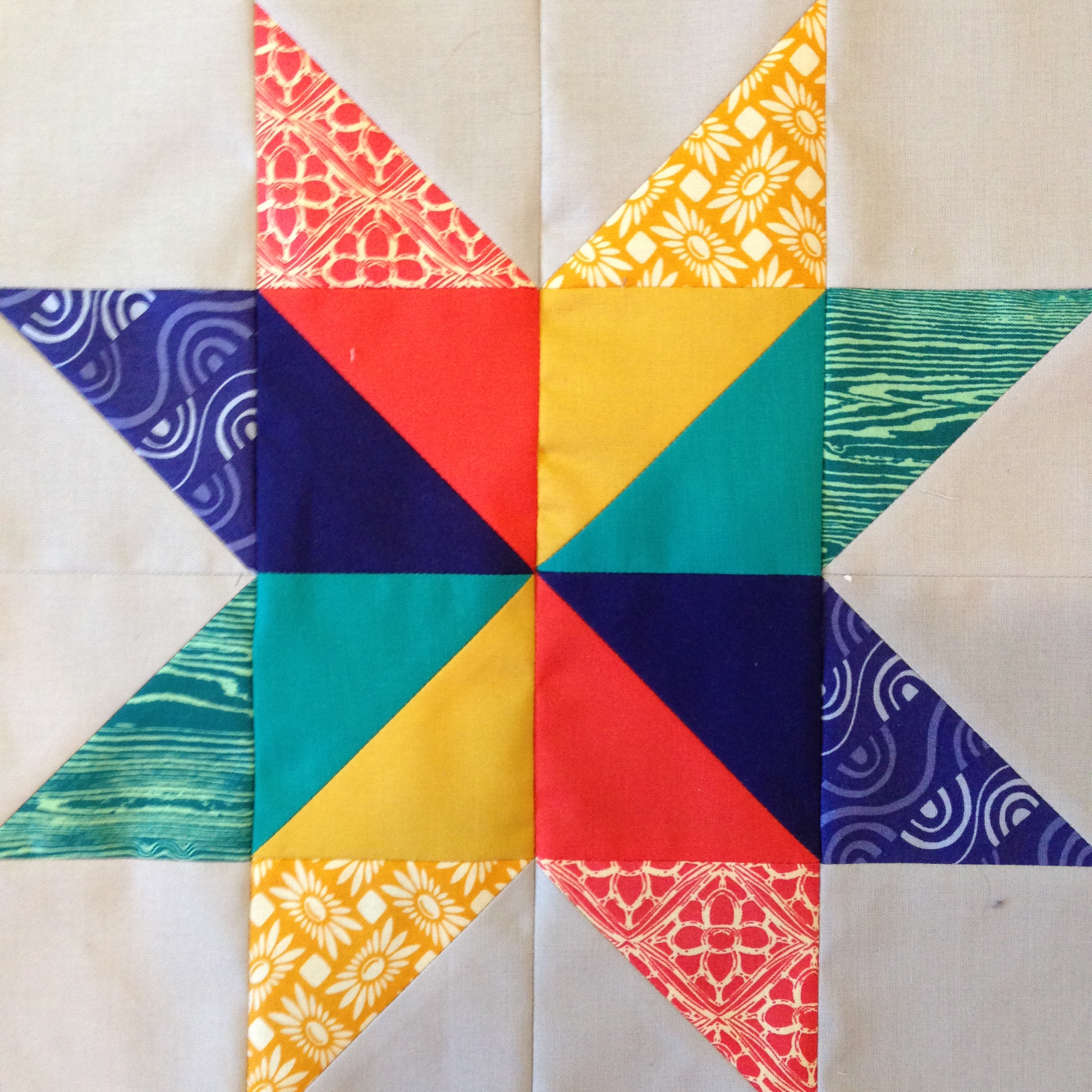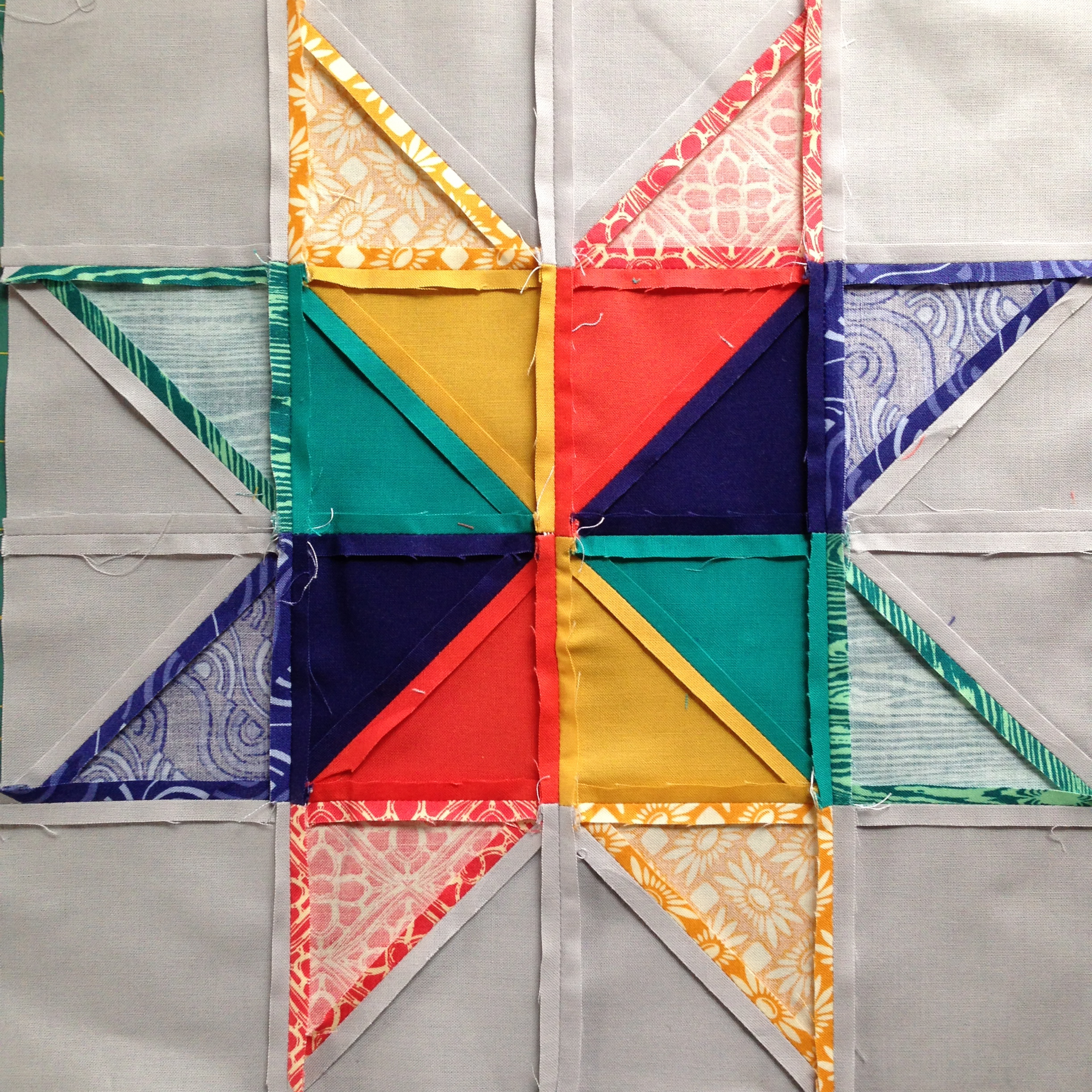 Because these are samples that will be used for teaching and hang in the store, I took extra care to match corners and press seams. The backs of my blocks rarely look like this, but I just have to document this star. I pressed every seam open. I never do that– for the other three blocks I nested the seams in each row. It looks amazing, but it takes a lot of patience.
