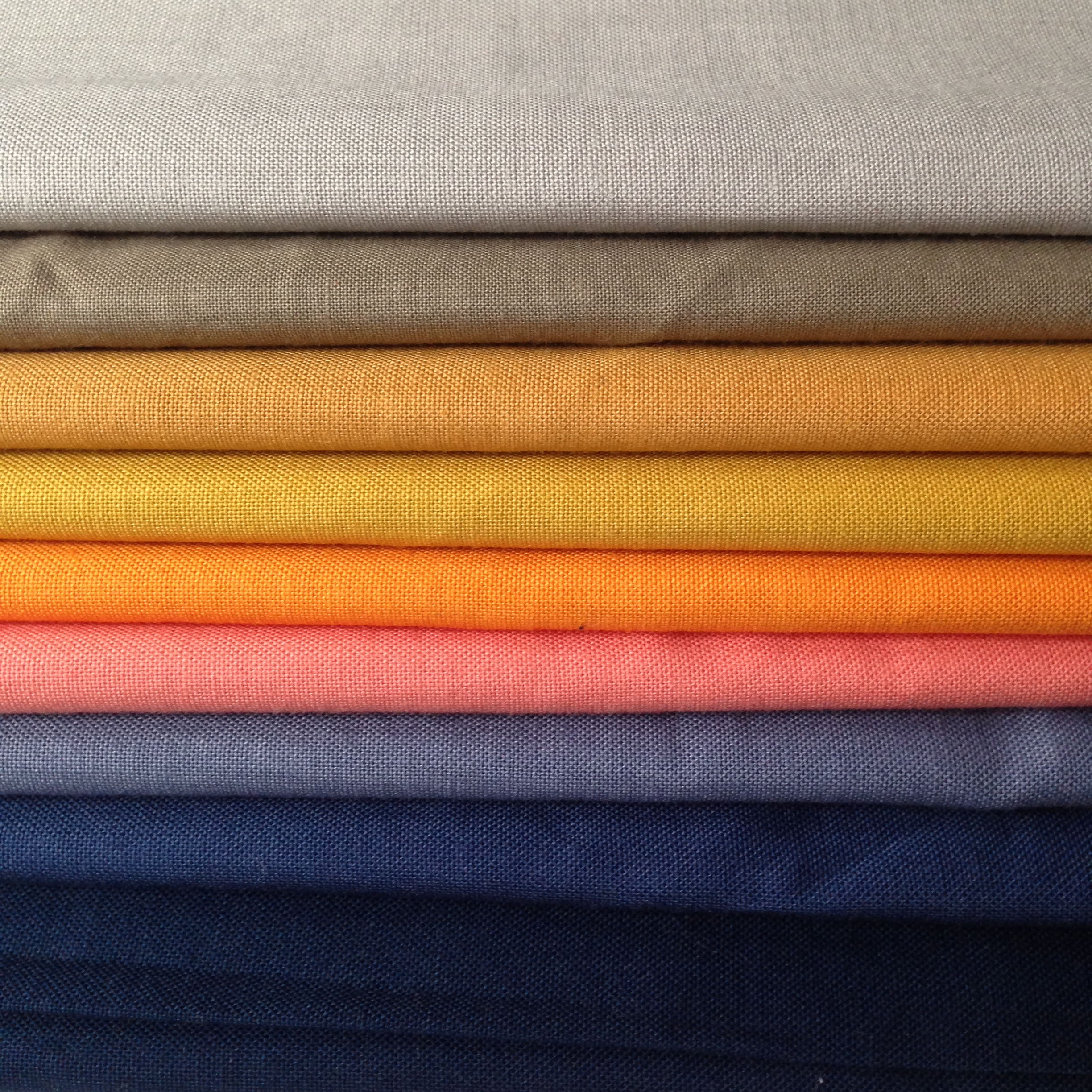 Kona Ash, Michael Miller Dirt, Kona Butterscotch, Curry, School Bus, Salmon, Slate, Windsor and Navy. I liked how different they could look in different combinations and how happy they made my eyes when they were all together.