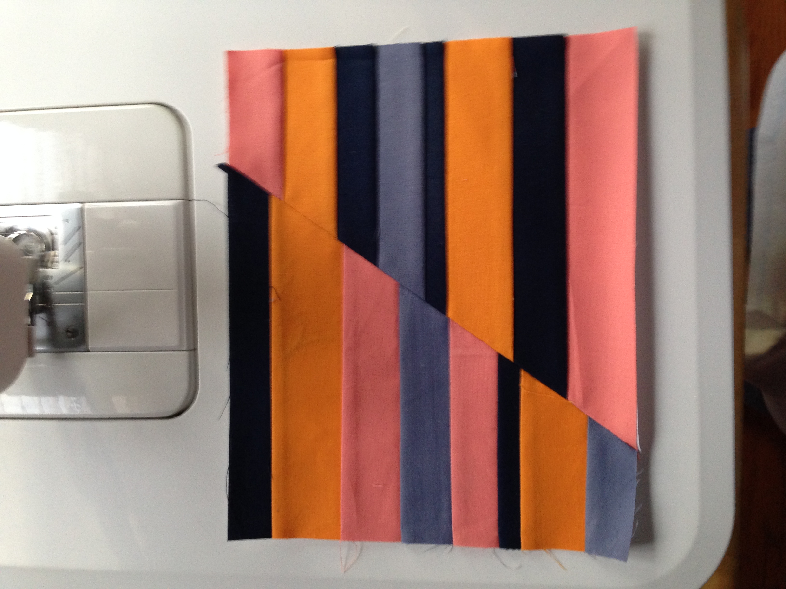 Carolyn told us to pick three colors for each block, but I started combining my strips and decided to go with four (rebel!). I made two blocks in class. To me, the left one is so feminine, and the right is masculine in comparison. Both have Ash, but I think it looks warmer in the block on the right. Near other blues, the Navy almost looks black.