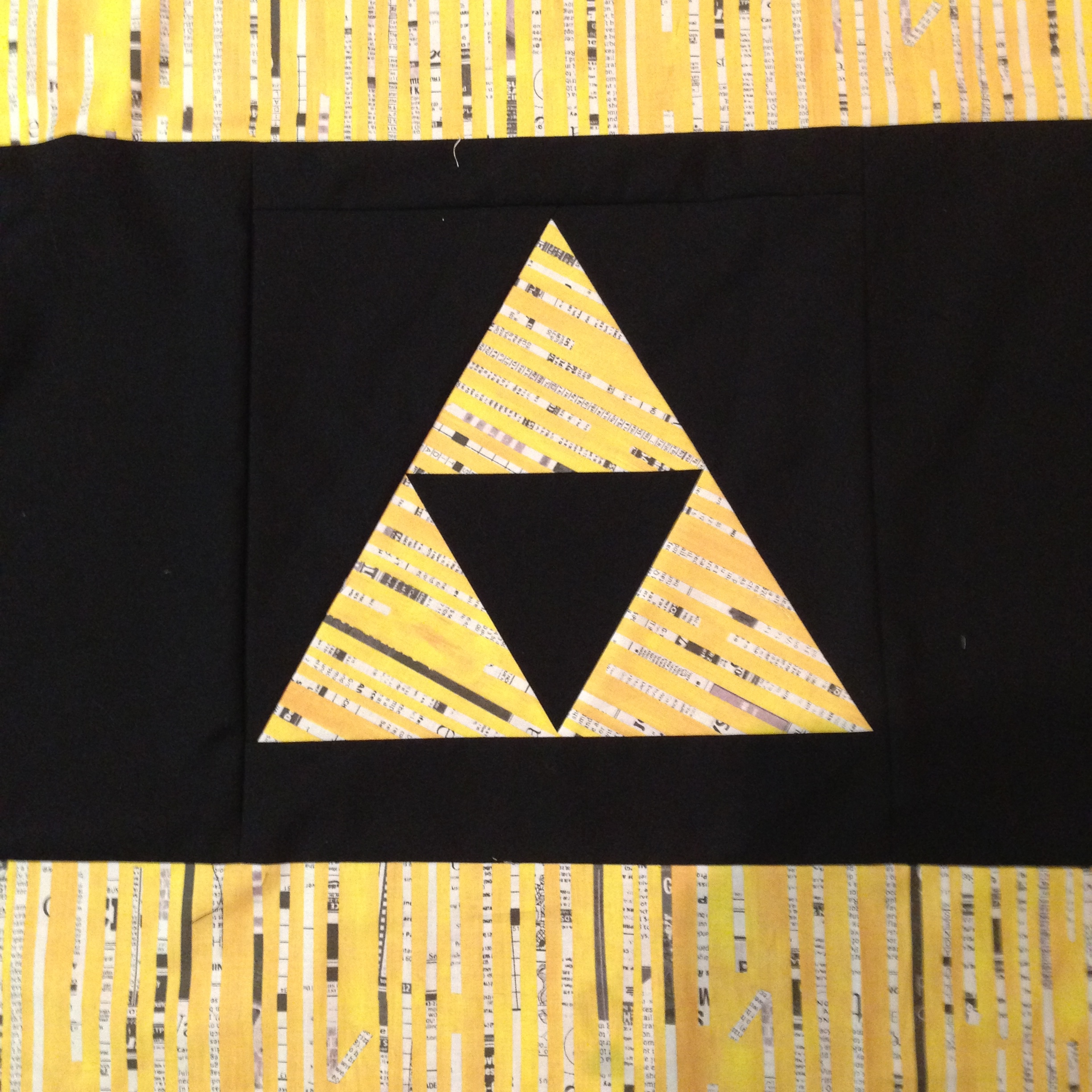 Speaking of backs (ugh, the blogging segues are a little rough), my husband made a request for the back of his: a Triforce from the Legend of Zelda. It was a great chance to learn how to piece 60 degree triangles cut with my new Hex ‘n’ more ruler.