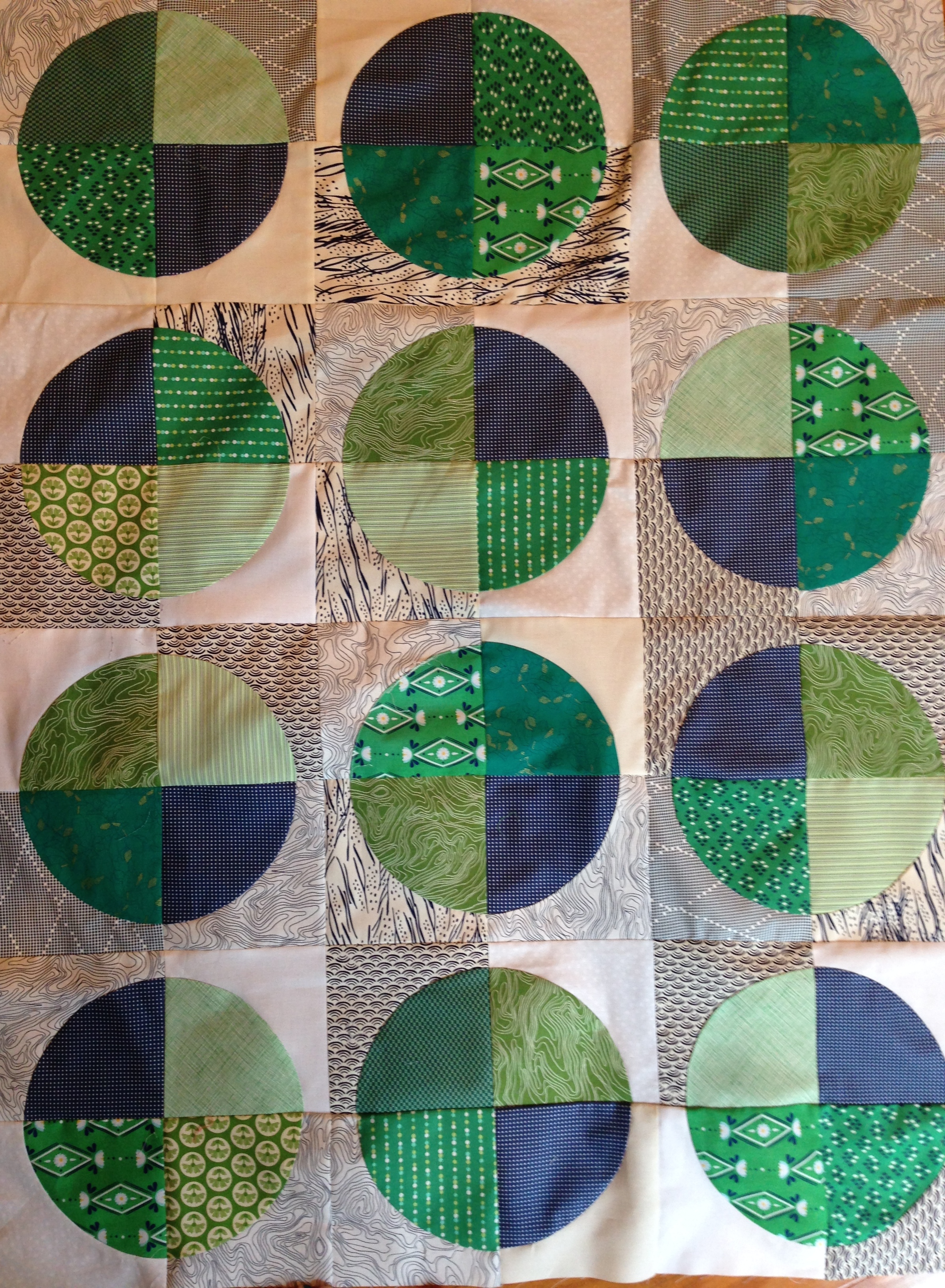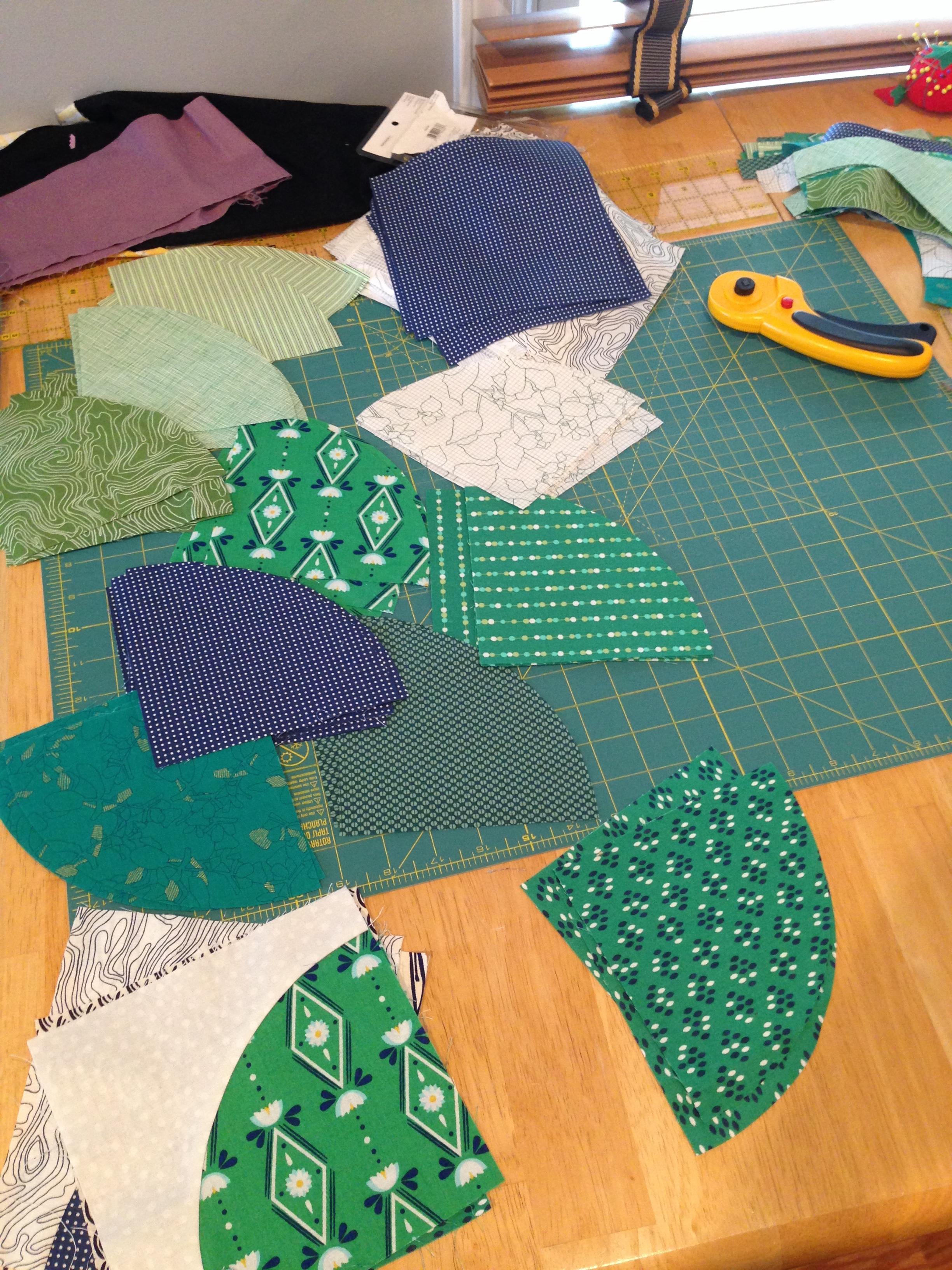 The plan was for low-volume navy and white as the background and all different shades of green and navy in the circles. I did try out some low-volume green (see the white wedges of Botanics next to the rotary cutter), but they didn’t work the same effect. Some of my “low volumes” were really just navy prints on white or ivory background. It was an excellent exercise in value and set rules for layout.