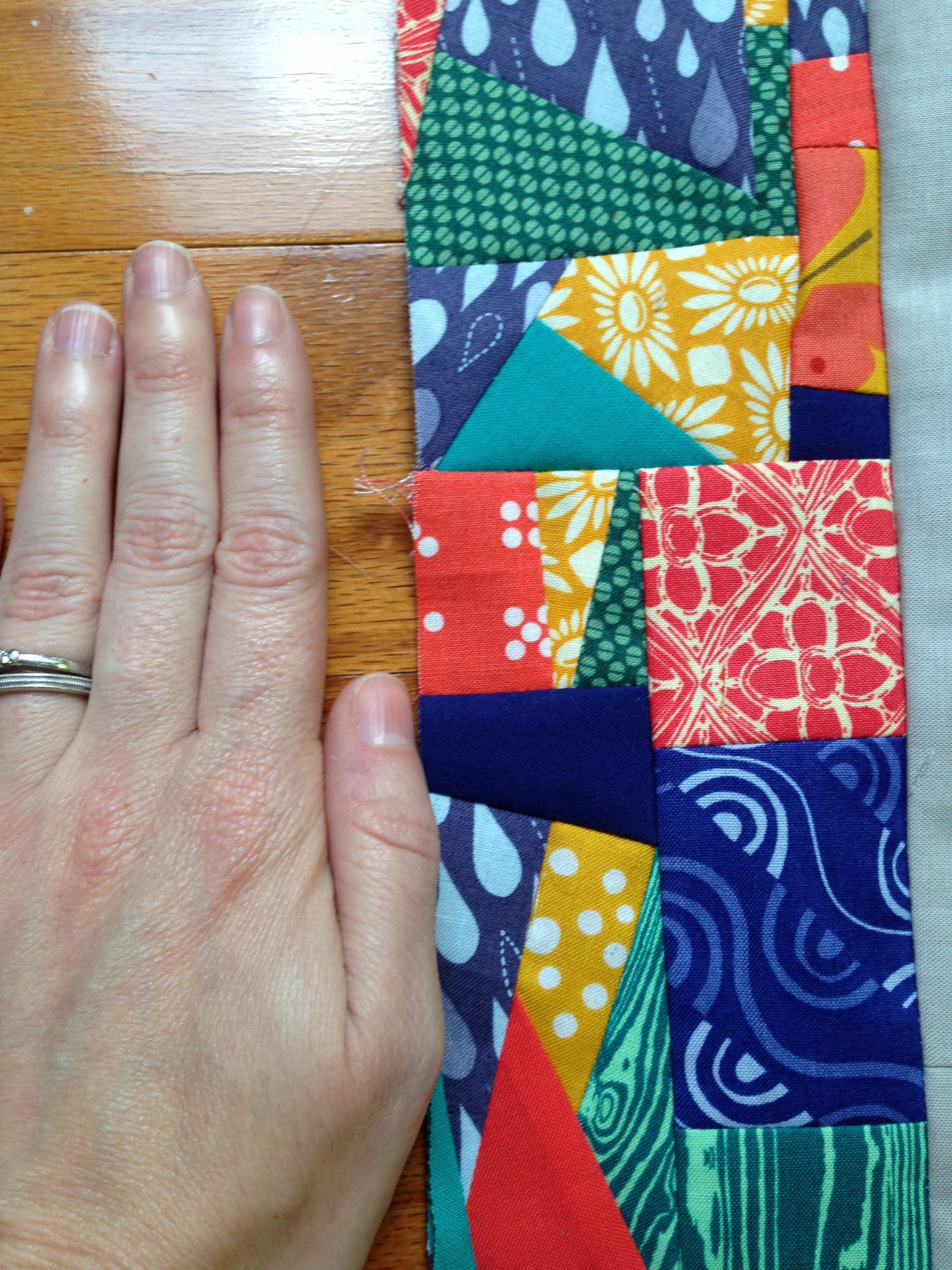 It’s beautiful so far — the center is a eye-catching, and the scrappy border is very interesting. But as I see it, it is either DONE, or you have quite a ways to go. I don’t think just one more colorful border will do it. (Sorry, I wish I could tell you why, but I’m not articulate tonight, either!)