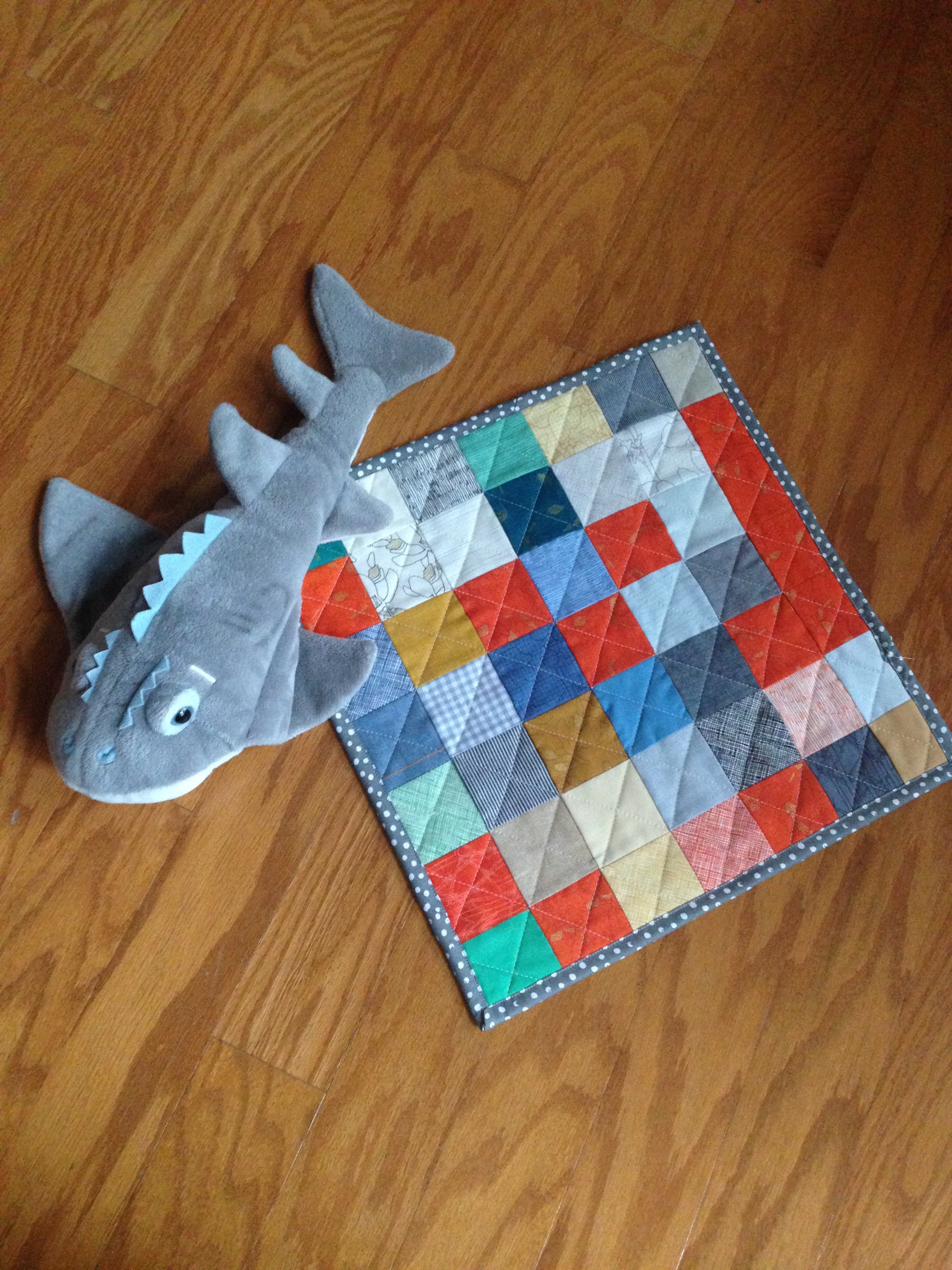 He made it about halfway through piecing before getting bored, which was completely understandable for a near-Kindergartener. But after a little TV time during which I sped along, he was very pleased to see the size (it needed to cover shark ray’s tail but NOT his eyes), even though it wasn’t a rectangle. He thinks all quilts should be rectangles. He also thinks that the quilting would look best with straight lines AND zig zags, so we compromised and did diagonal cross hatch. The binding is a gray Dear Stella dot.