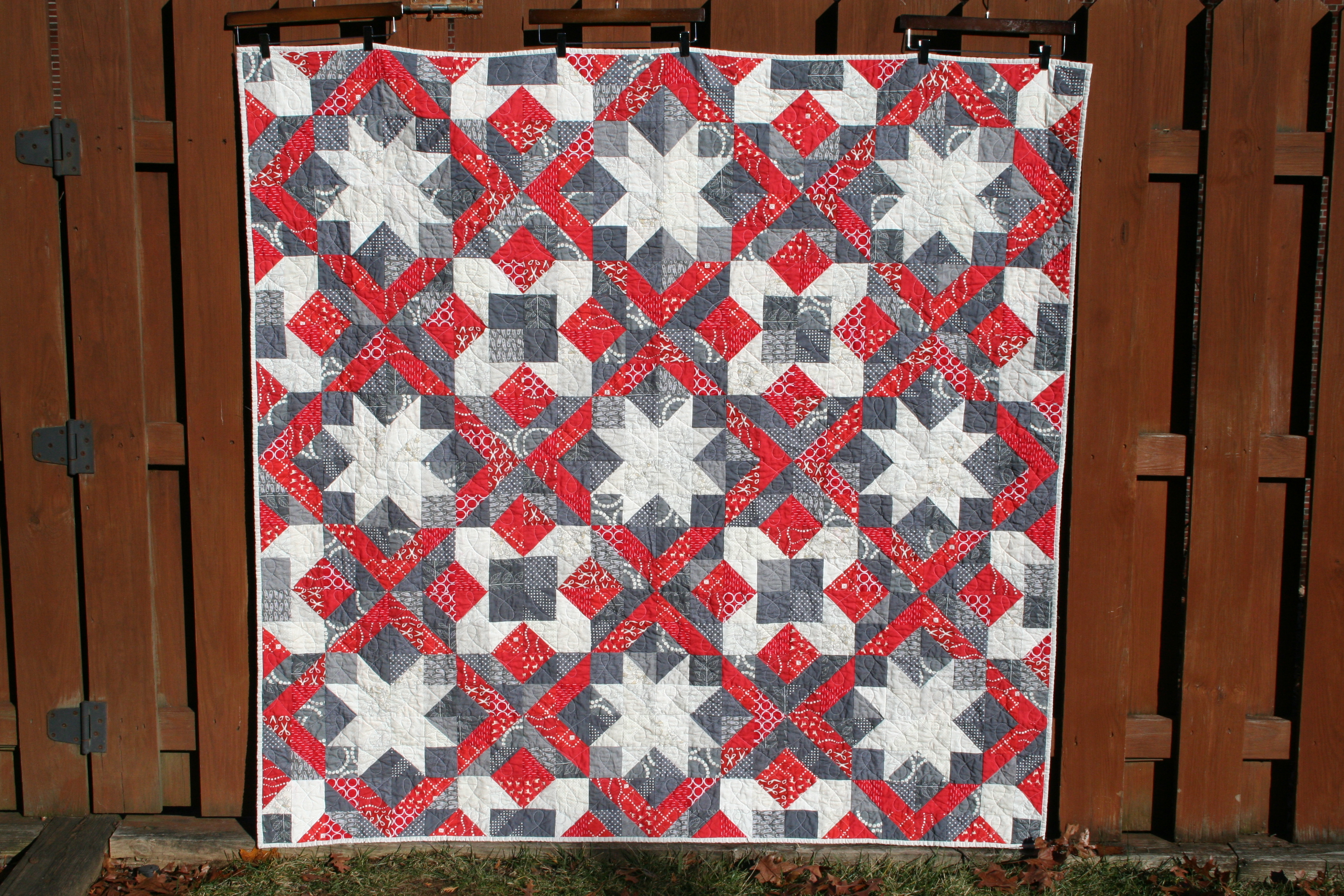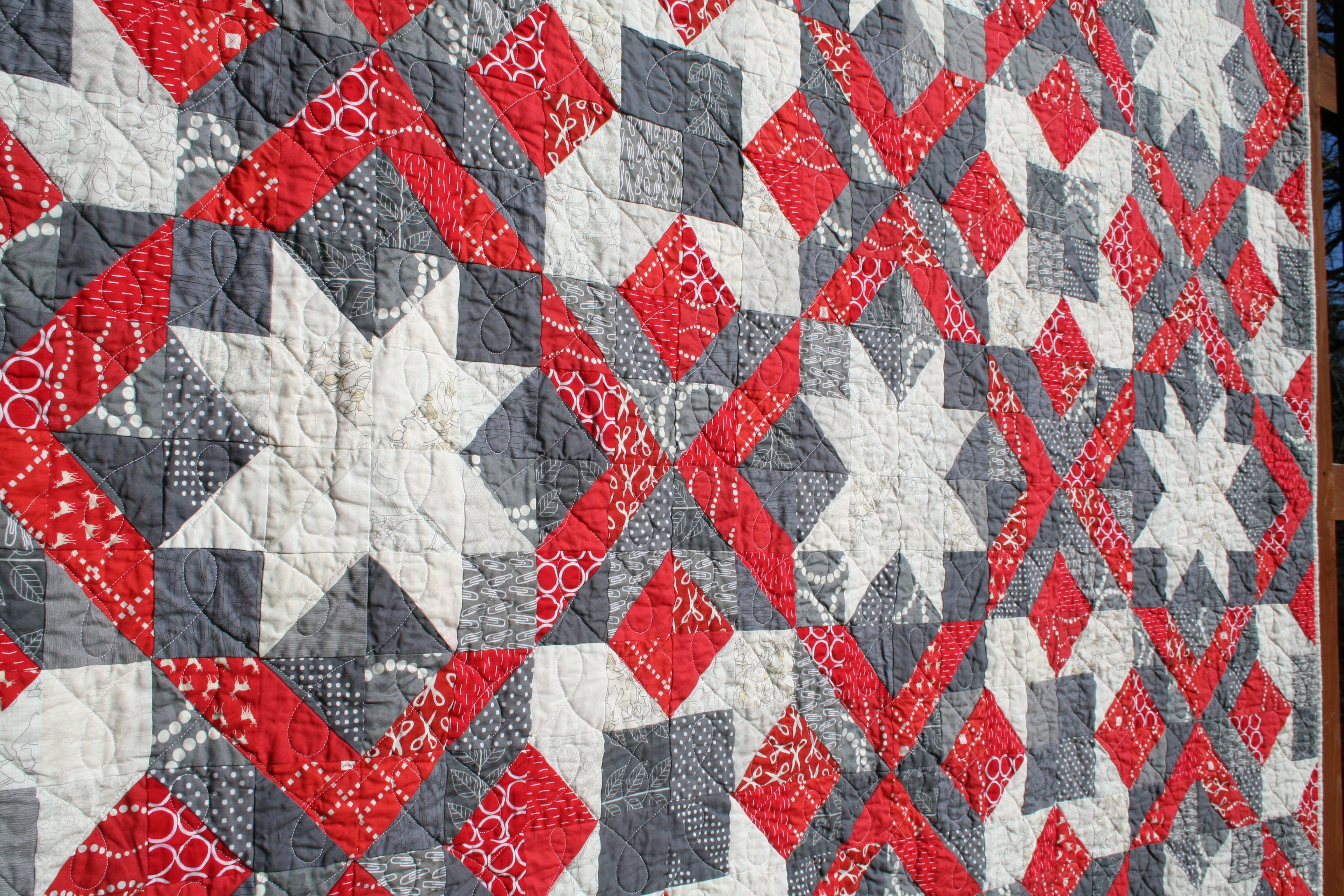 This was a bee quilt for my NJMQG block party group. I decided I wanted a Christmas quilt to go with our holiday decorations, one that would come out for snuggling in the darkest months of the year. I found some inspiration and designed something rather traditional that would use a palette of red, white, and gray. I found a way to use a single block that, assembled, would make stars and “snowflakes,” which are both major themes of our Christmas tree ornaments (the pattern is here).