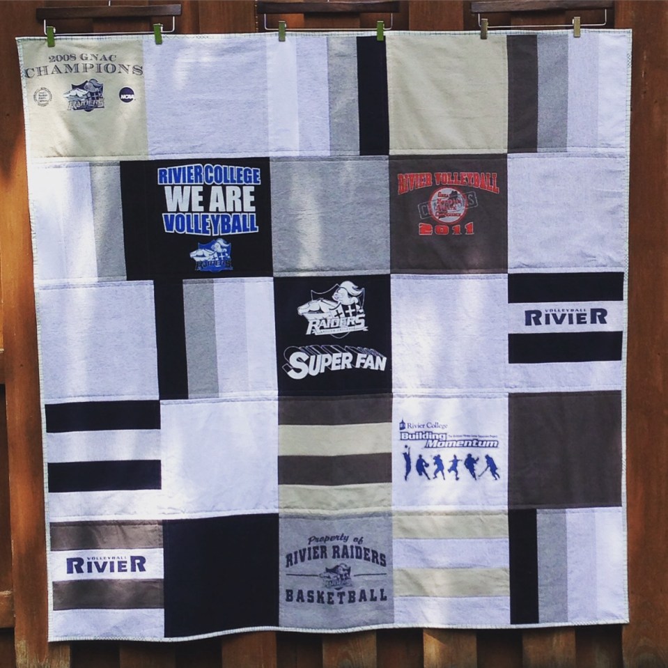 In the winter, my cousin Lauren, who played volleyball for Rivier College not long ago, asked if I knew anyone who might be able to make her a quilt from Tom’s Rivier t-shirts. He and my aunt were her biggest supporters, and there were eight shirts in his XL size. I said, yes, you ask your cousin the quilter. I couldn’t imagine anyone else making this quilt, and I took the job very seriously.