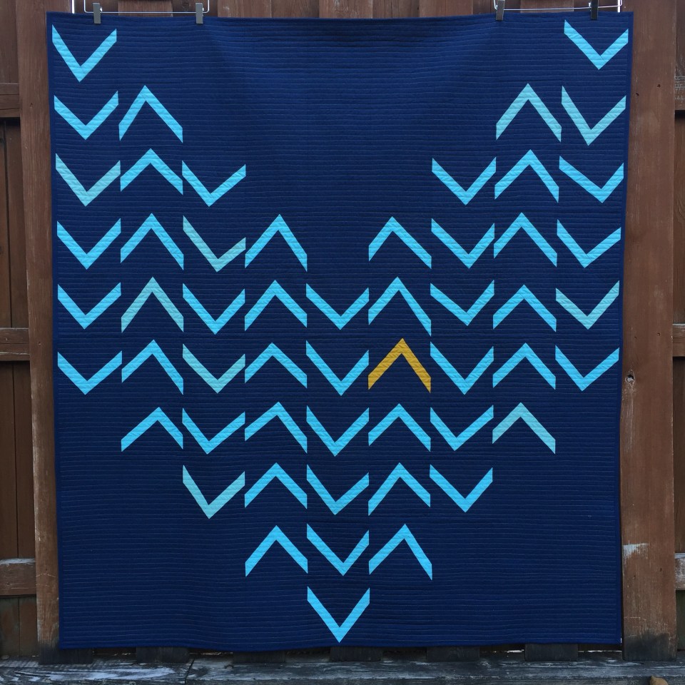 For Rally, I used all Cirrus Solids from Cloud9 Fabrics on the top. The background fabric is Ocean, the angles are Sky and Rain, and the accent angle is Amber. I quilted with organic straight lines about 1/2″ apart in Aurifil #TKTK, Light Brass.