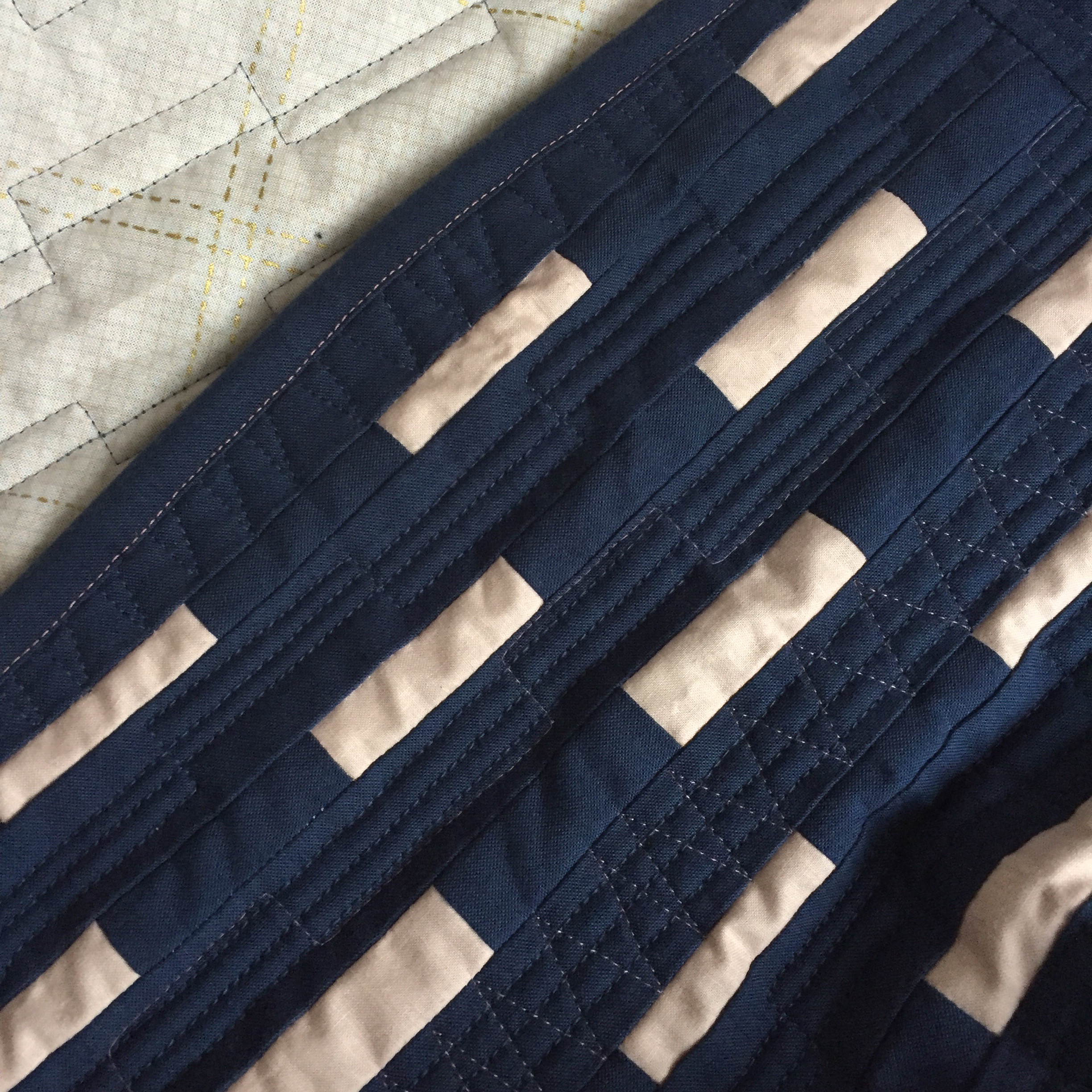 I realized that part of my personal self-care involves being realistic about my limitations and asking other people for help when I need it. So in one of the best decisions I could have made for this project, I enlisted the help of the wonderful and talented Krishma Patel to quilt it. I gave her a plan– no curves, as much crosshatch as you like– and she improvised in the negative space, of which there is a lot. She turned negative space into focal points, and really brought the whole quilt to life.
