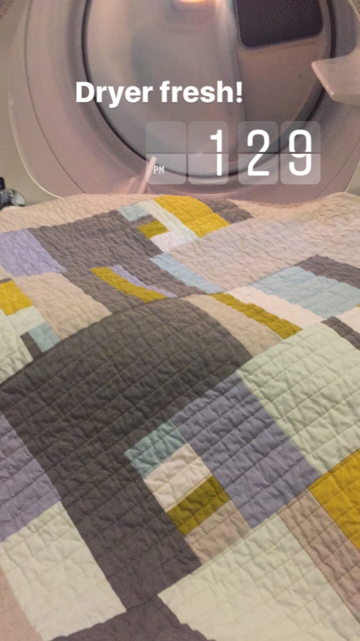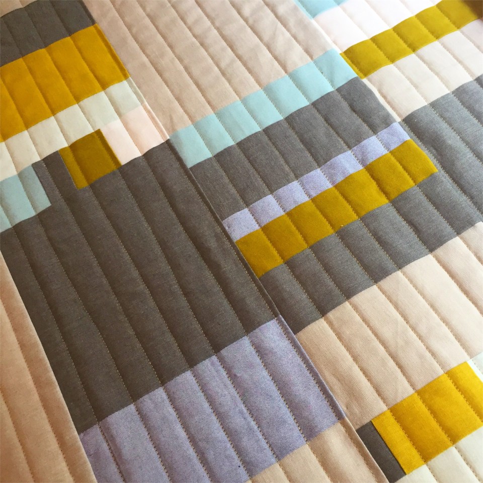 The quilting is organic lines spaced about an inch and a half in Aurifil Light Brass. I put a pop of yellowish green in the binding and washed it for a good crinkle. (It was so fun to pull it out of the dryer and broadcast it on Instagram Stories!)