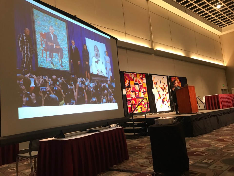 Chawne Kimber demonstrate Art Critique with the Obama portraits. (I sat in the front row!)