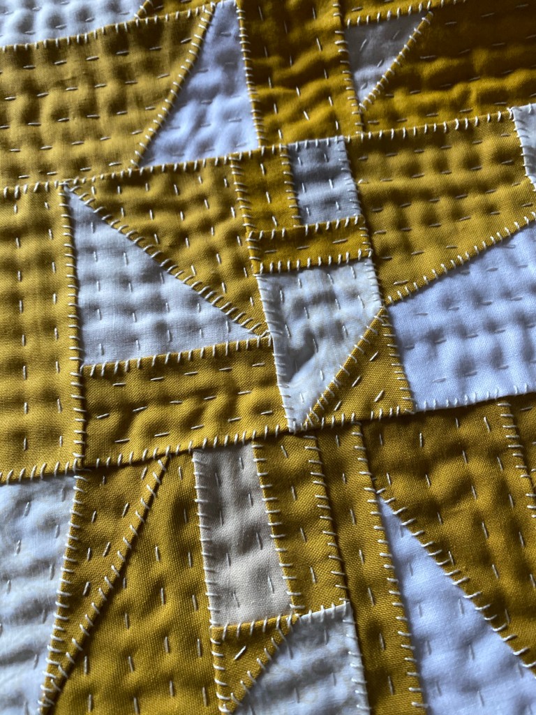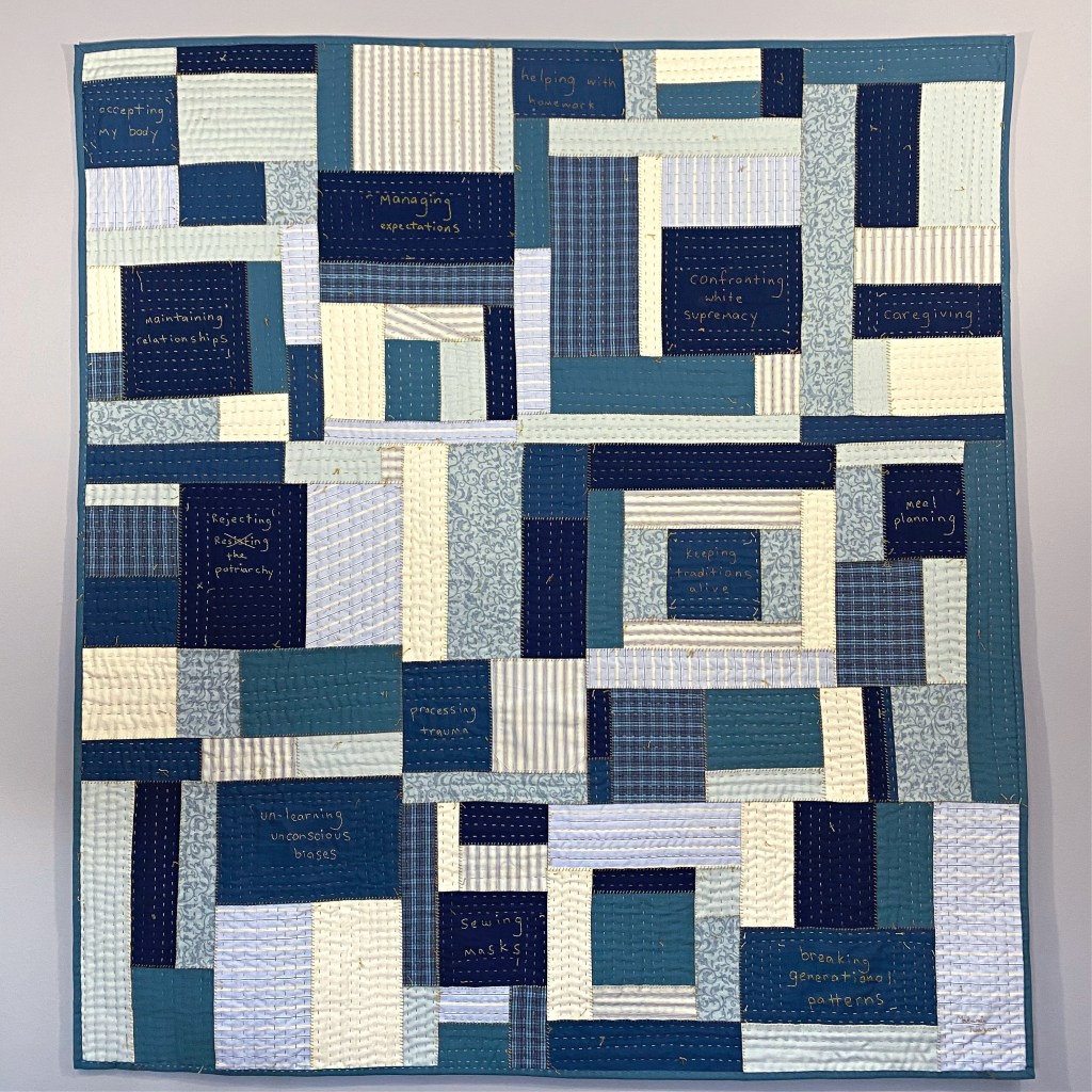Later in November, I finished a new quilt made entirely by hand, the one that I started in June. Its title is Holding Things Together (Show the Work). The piece is held together by work that is usually invisible, work that holds a lot more together than is credited. From piecing stitches and knots to thought processes and actions, there is important labor that is often hidden and/or taken for granted by others. The pandemic has exposed this further by forcing people to retreat to domestic spheres, but what is actually seen and honored? Who is holding things together with invisible work, and who values it? Every stitch of the quilt was sewn by hand in golden thread on bed sheets, striped “work” shirts and quilting cotton. It’s 49” x 51” and work that I am very proud of.
