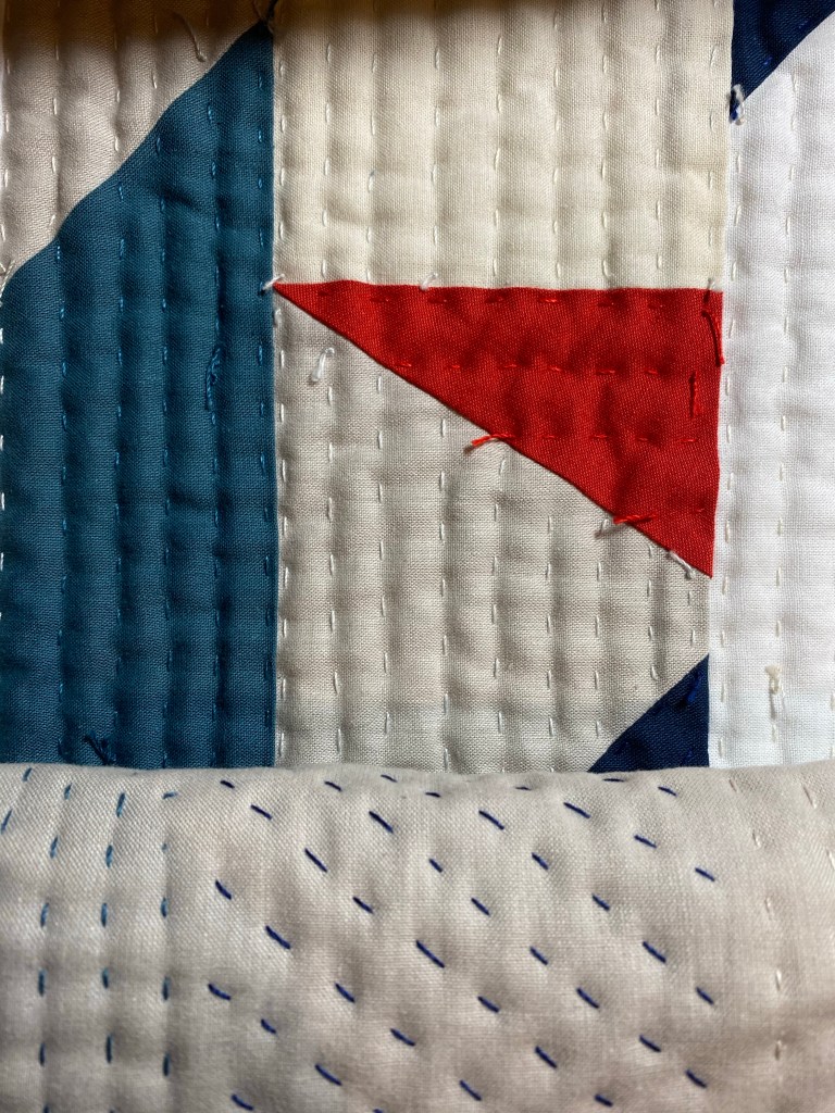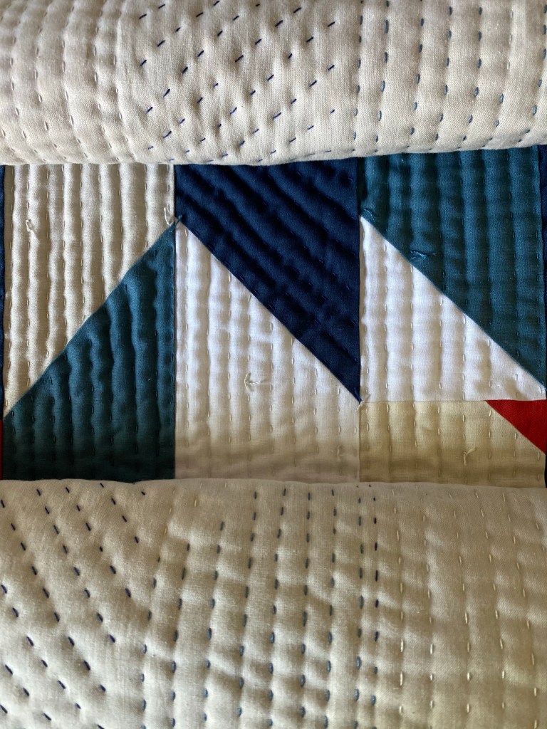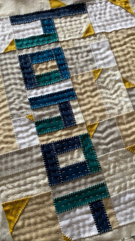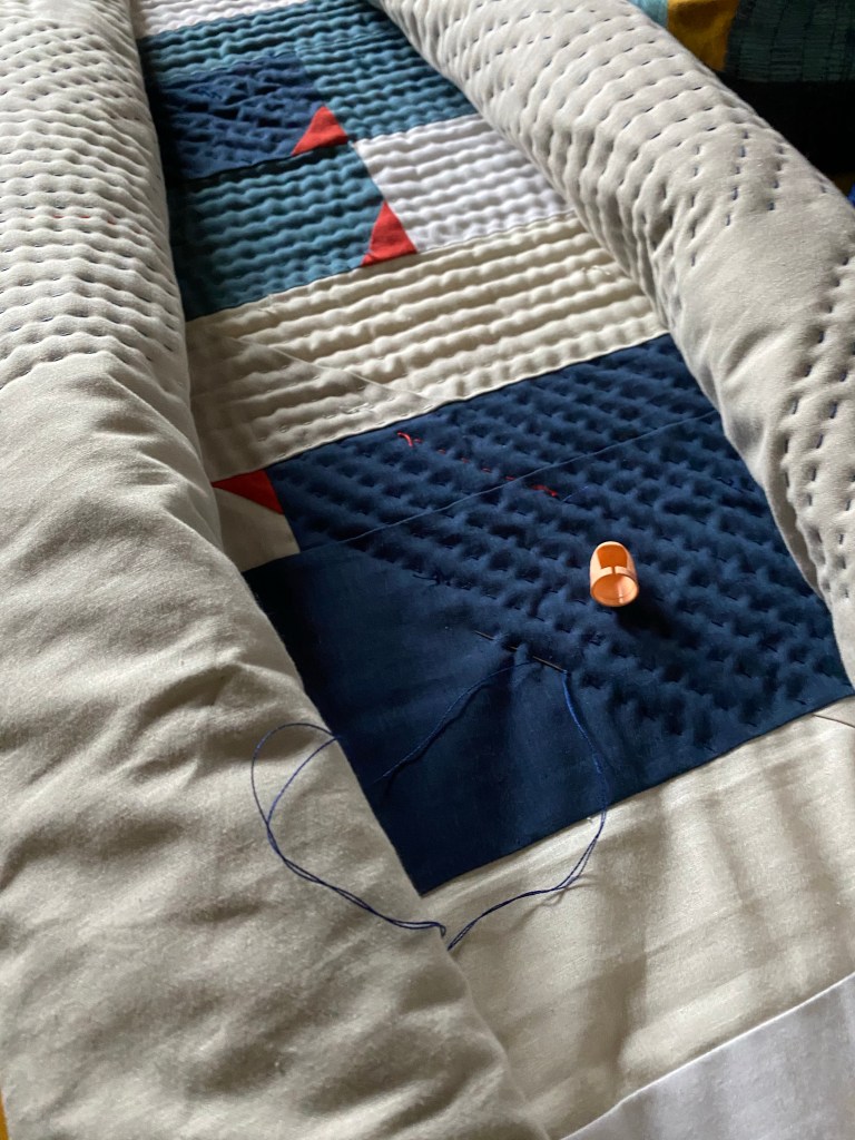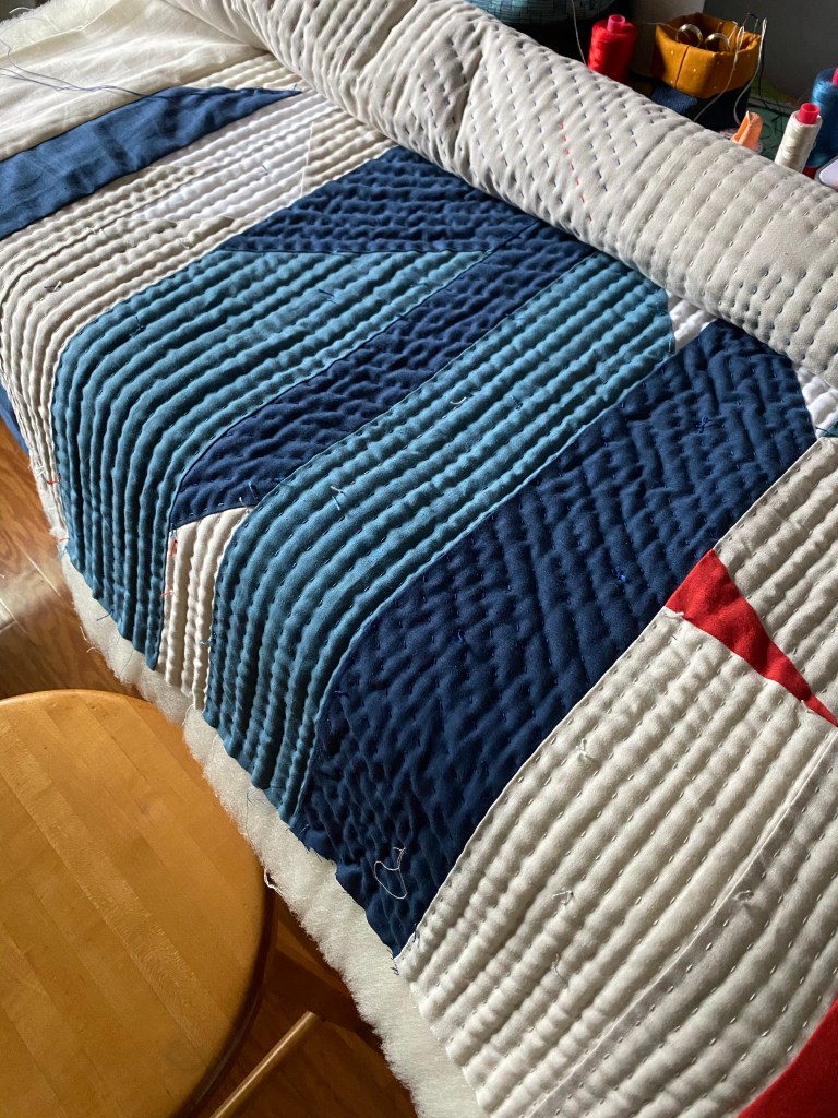 During this time I also dove into quilting the top that I had made as a part of Anne and my improv class, which was piecing that took direction from a story. The story was about my anxiety surrounding the presidential election, compounded by the pandemic. Not light stuff, but I’ve found that using my feelings in my quilts has been monumentally helpful. Hand quilting such a big piece gave me a lot of space to think about what had happened, what was happening in the world, and how I wanted to honor myself. The meditation gave me the quiet and space that I needed to work through everything stirred up in the pandemic, the election (and subsequent insurrection), and the stresses of re-opening.