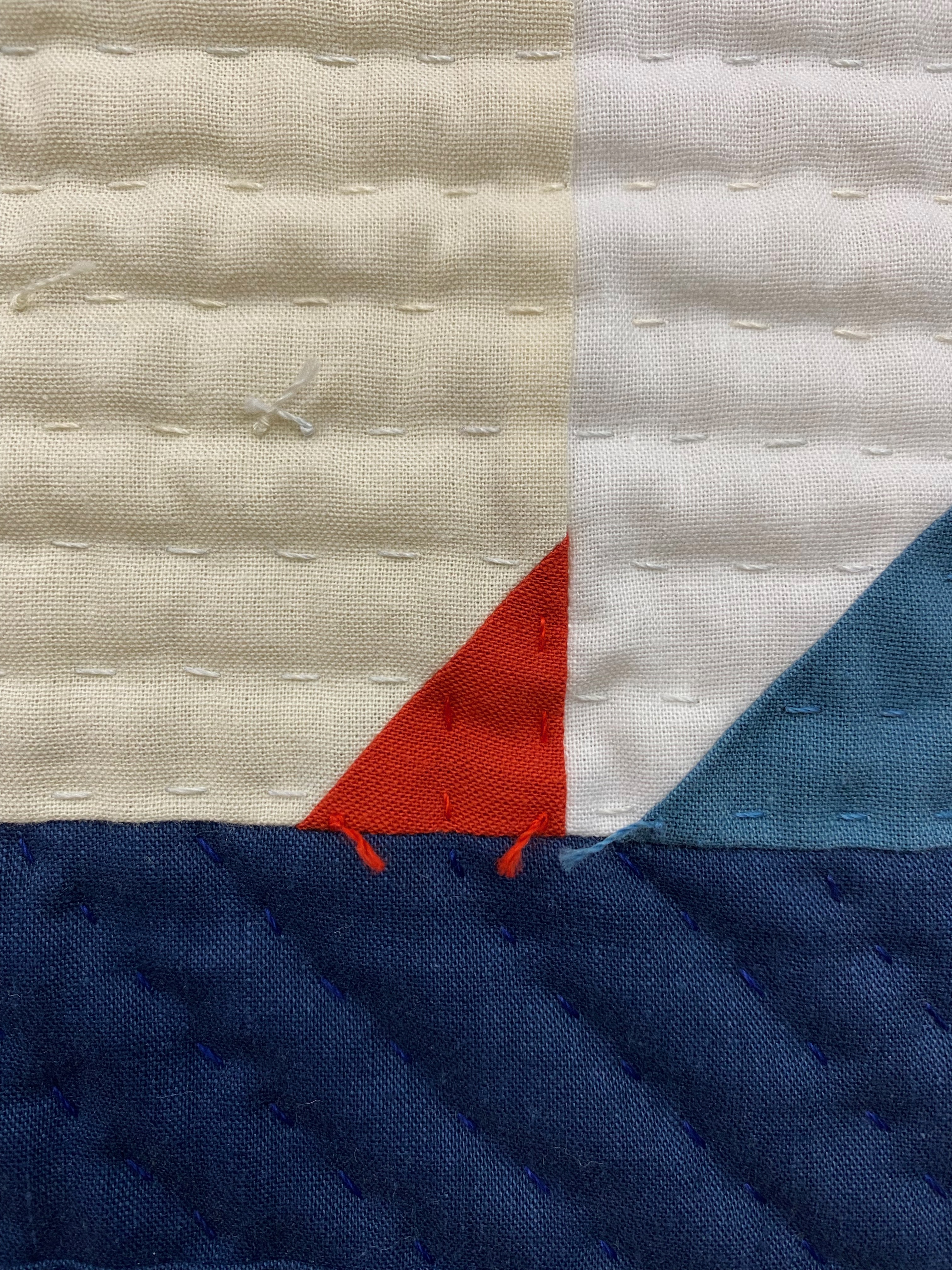 Pieced by machine quickly and quilted by hand slowly, this quilt gave me the opportunity to process those pointy feelings and demonstrate internal work with knots representing strength.