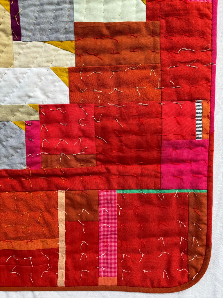 Once I identified the blocks as representing Dorothy as a noble (inert?) sorceress, I knew the quilt needed red. Red is power and feeling and it needed to envelop but also integrate. As I pieced the rest of the top I added small pieces of fabric that represent the witches of Oz and their allies, creating a kind of coven.